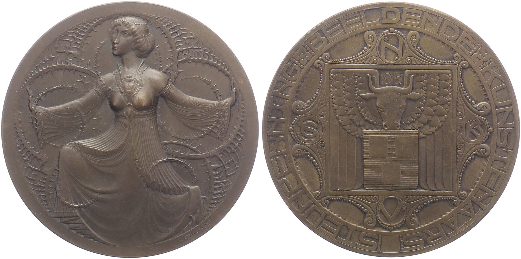 1915 Nederlands Steuncomité voor beeldende kunstenaars. Dansende vrouwenfiguur. / Wapen van St. Lucas. Æ 65. JP 19. C.J. van der Hoef. Prachtig.
