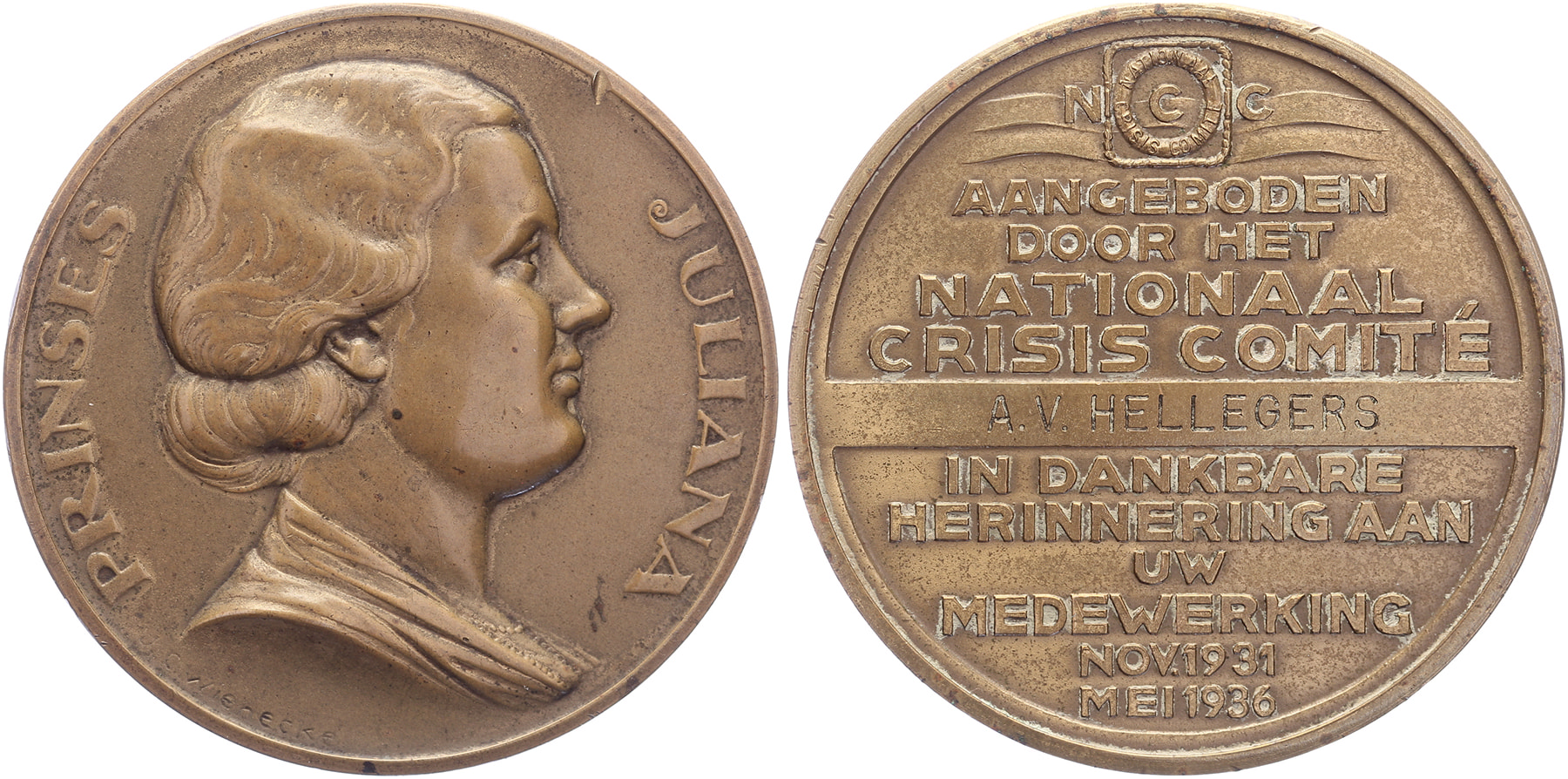 1936 Opheffing Nationaal Crisiscomité. Buste prinses Juliana naar rechts. / Logo NCC + tekst. O.n.v. A.V. Hellegers. Æ 50. CJCW 382a. J.C.Wienecke. Lichte randbeschadiging vz. Prachtig.