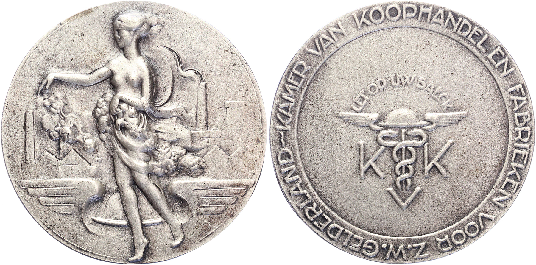 z.j. (±1942) Tiel. Erepenning Kamer van Koophandel en fabrieken Z.W. Gelderland. Naar links lopende naakte vrouw met bloemen; op de achtergrond fabrieken. / Logo KvK, een mercuriusstaf.AR 81 [218 gram]. Vgl. KB III-707; De Beeldenaar 1982, pag. 192/193. Gijs Jacobs van den Hof. Zeldzaam. Zeer fraai.