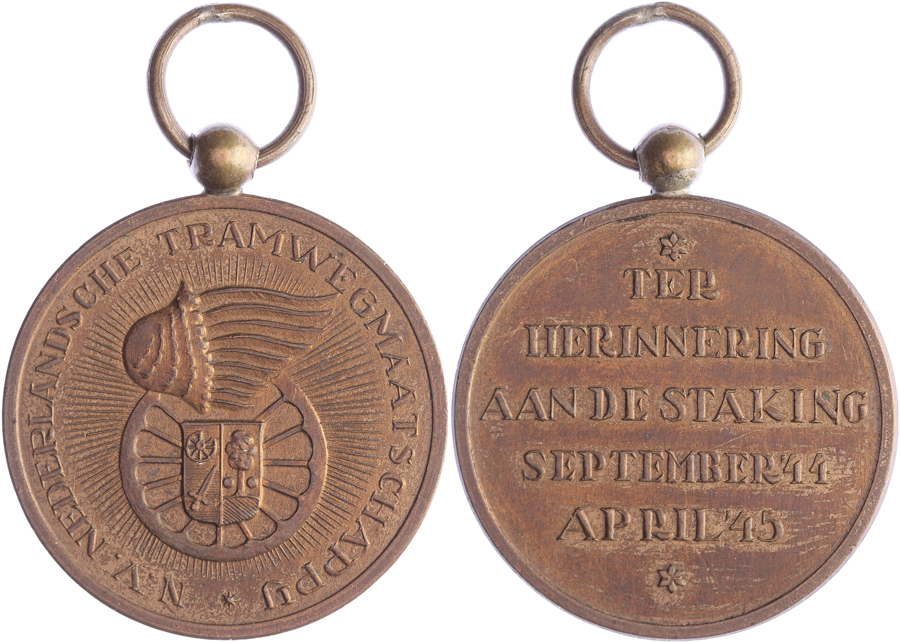 1945 Staking Nederlandsche Tramwegmij. september 1944 – april 1945. Logo van de Mij in stralenkrans. / Vijfregelig opschrift. Æ 30 met draagoog. Schaars. Prachtig.