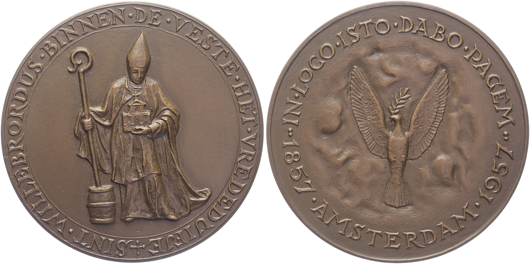 1957 Amsterdam. Eeuwfeest Willibrorduskerk. Staande St. Willibrordus met maquette nieuwe kerk in zijn hand. / Vredesduif omgeven door wolken. Æ 60. KB V-2361. (Geurt Brinkgreve). Prachtig.