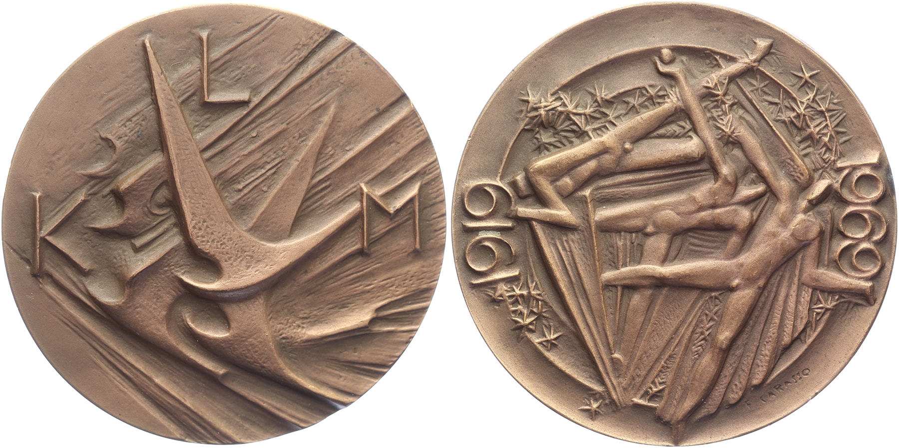 1969 50 jaar Koninklijke Luchtvaart Mij. Vliegende gestileerde vogels. / Drie naakte figuren op een achtergrond van sterren en stralen. Æ 60. KB VI-3521. Fed. Carasso. In origineel doosje Begeer. Prachtig.