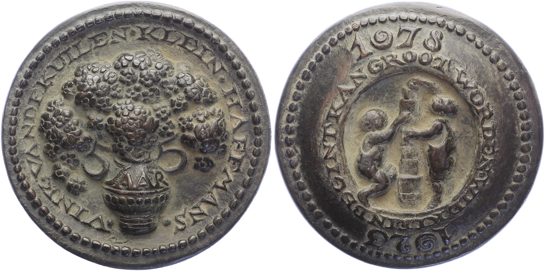 1978 Amsterdam, 55 jr. architectenbureau Vink, Van de Kuilen, Klein Haffmans. Rijk gevulde vaas met bloemen. / Twee kinderen bouwen een toren van blokken.Æ gegoten 87/89. De Beeldenaar 2000, pag. 115, nr. 35. (Ruth Brouwer). Prachtig.