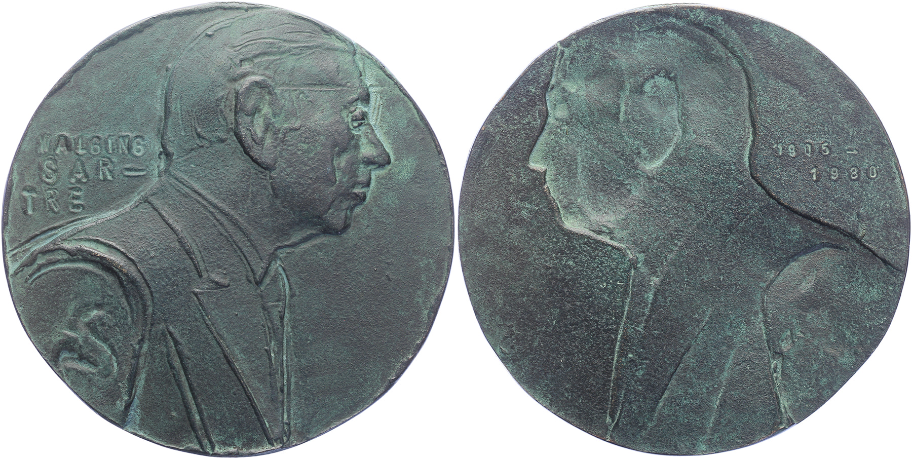 1980 Walging Sartre (boek). Buste manspersoon naar rechts. / Buste manspersoon verdiept naar links + jaartallen. Æ gegoten 102. (Eric Claus). Prachtig.