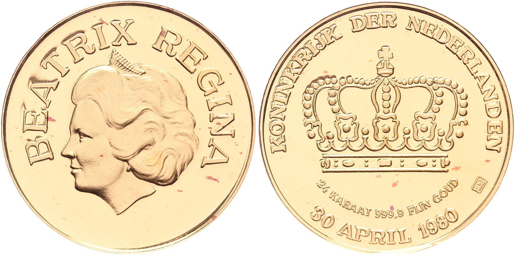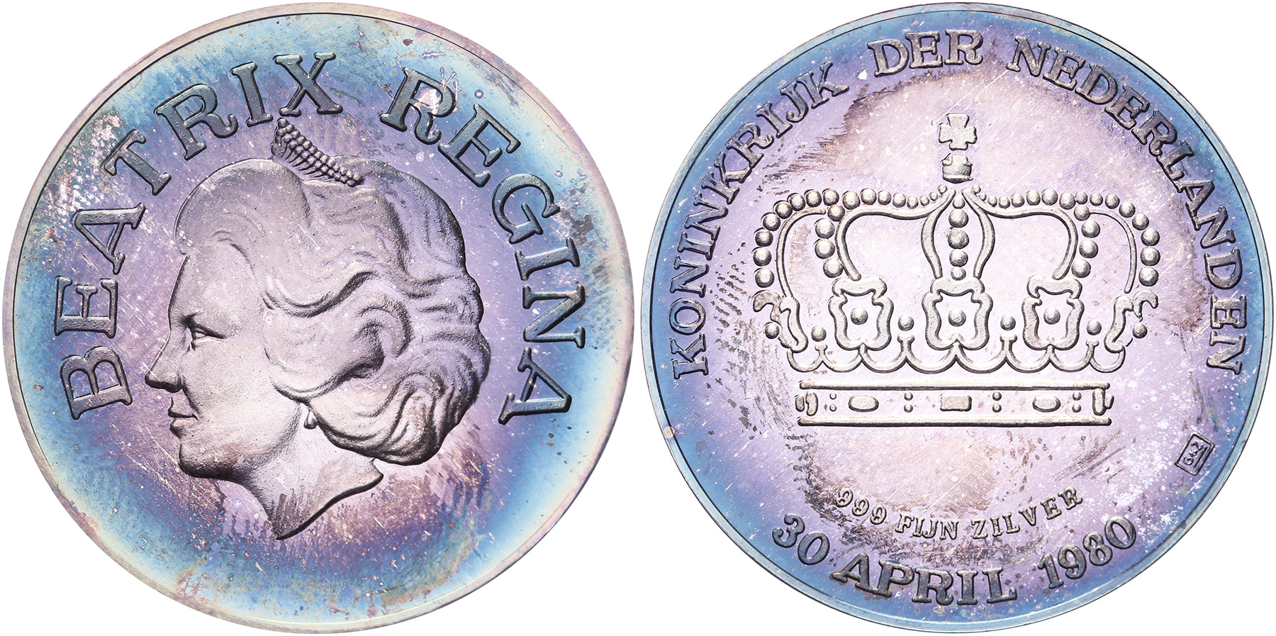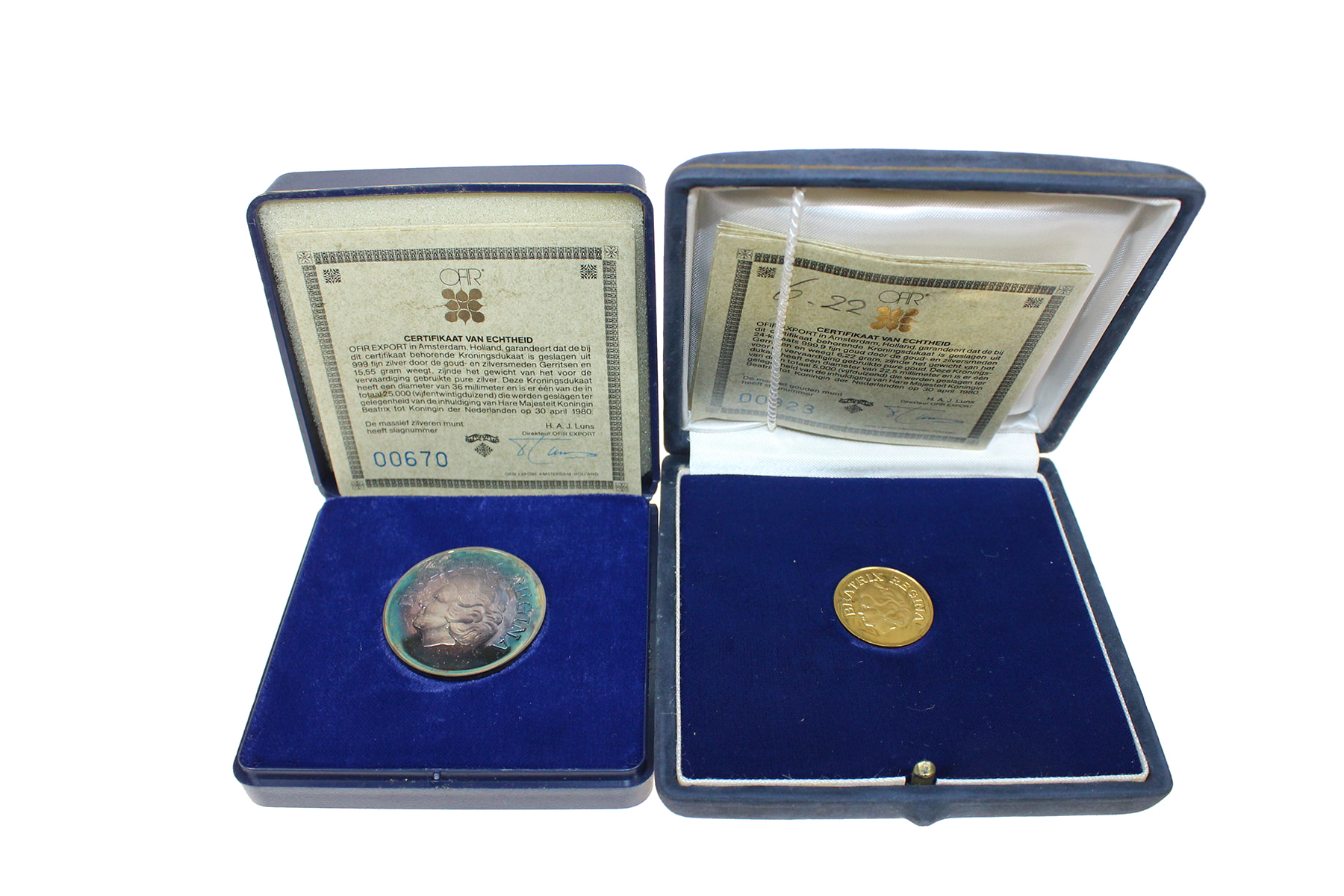 Lot (2) 1980 Inhuldiging Beatrix. Hoofd Beatrix naar links. / Koningskroon centraal. AU 22 [6,22 gram, 999/1000] en AR 36 [15,55 gram, 999/1000]. Beperkte oplage.