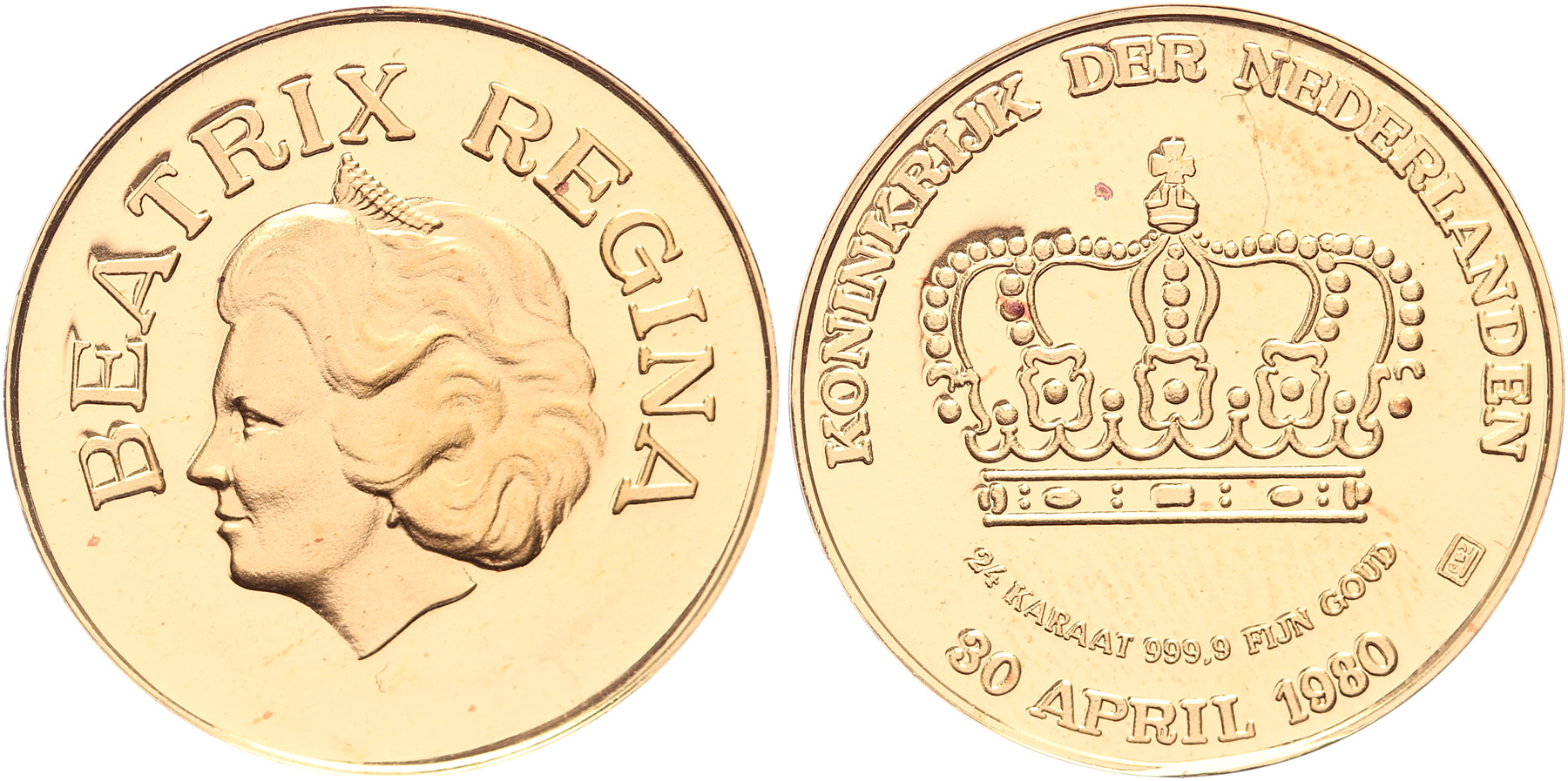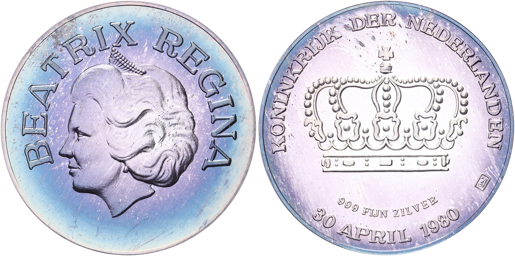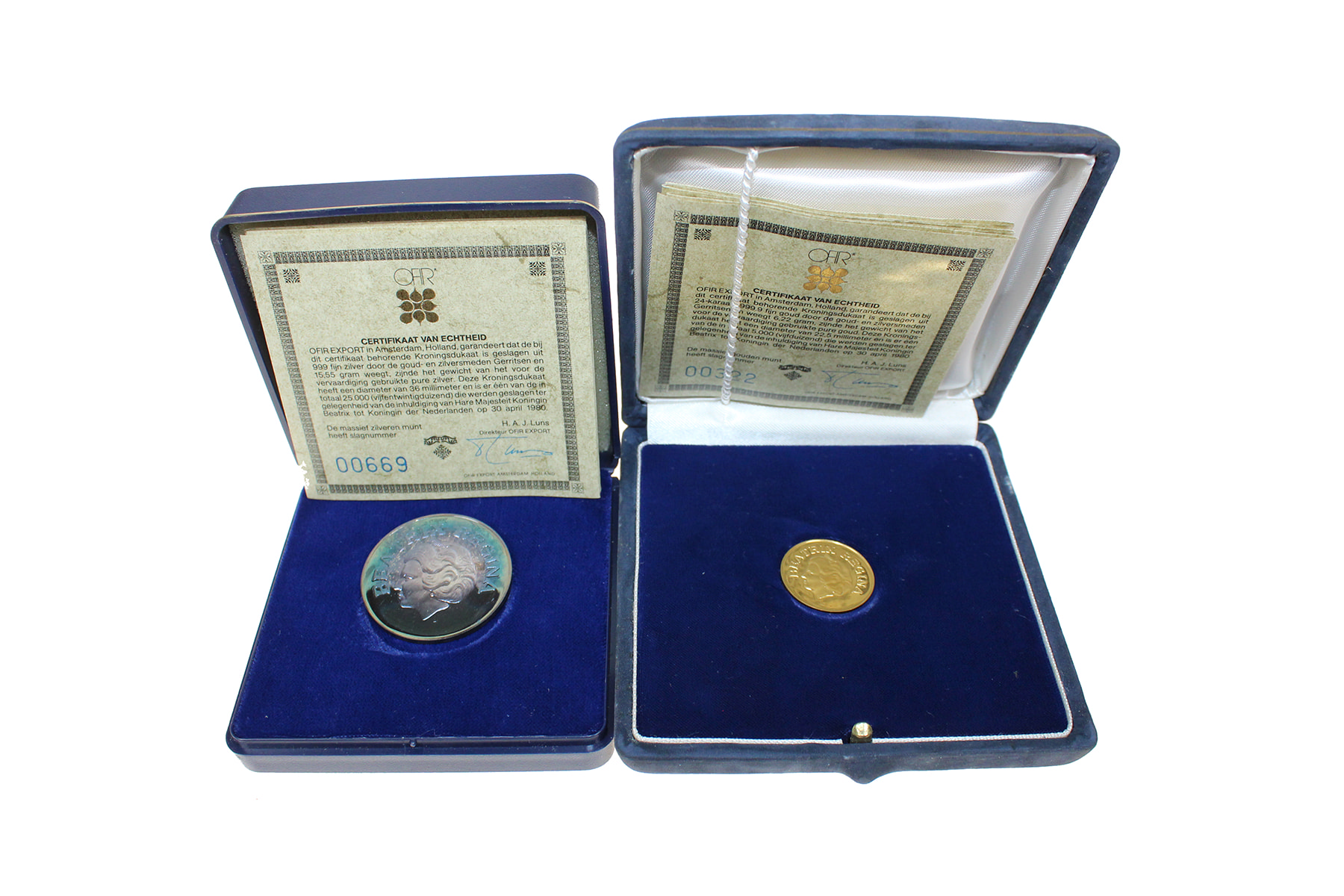 Lot (2) 1980 Inhuldiging Beatrix. Hoofd Beatrix naar links. / Koningskroon centraal.AU 22 [6,22 gram, 999/1000] en AR 36 [15,55 gram, 999/1000]. Beperkte oplage.