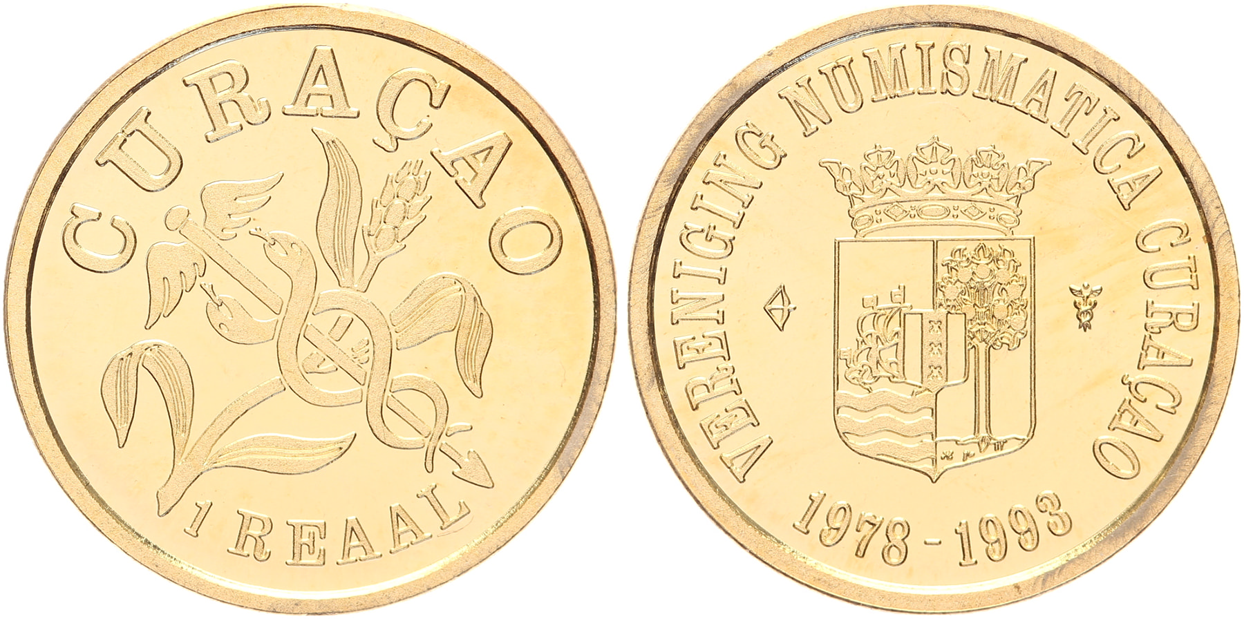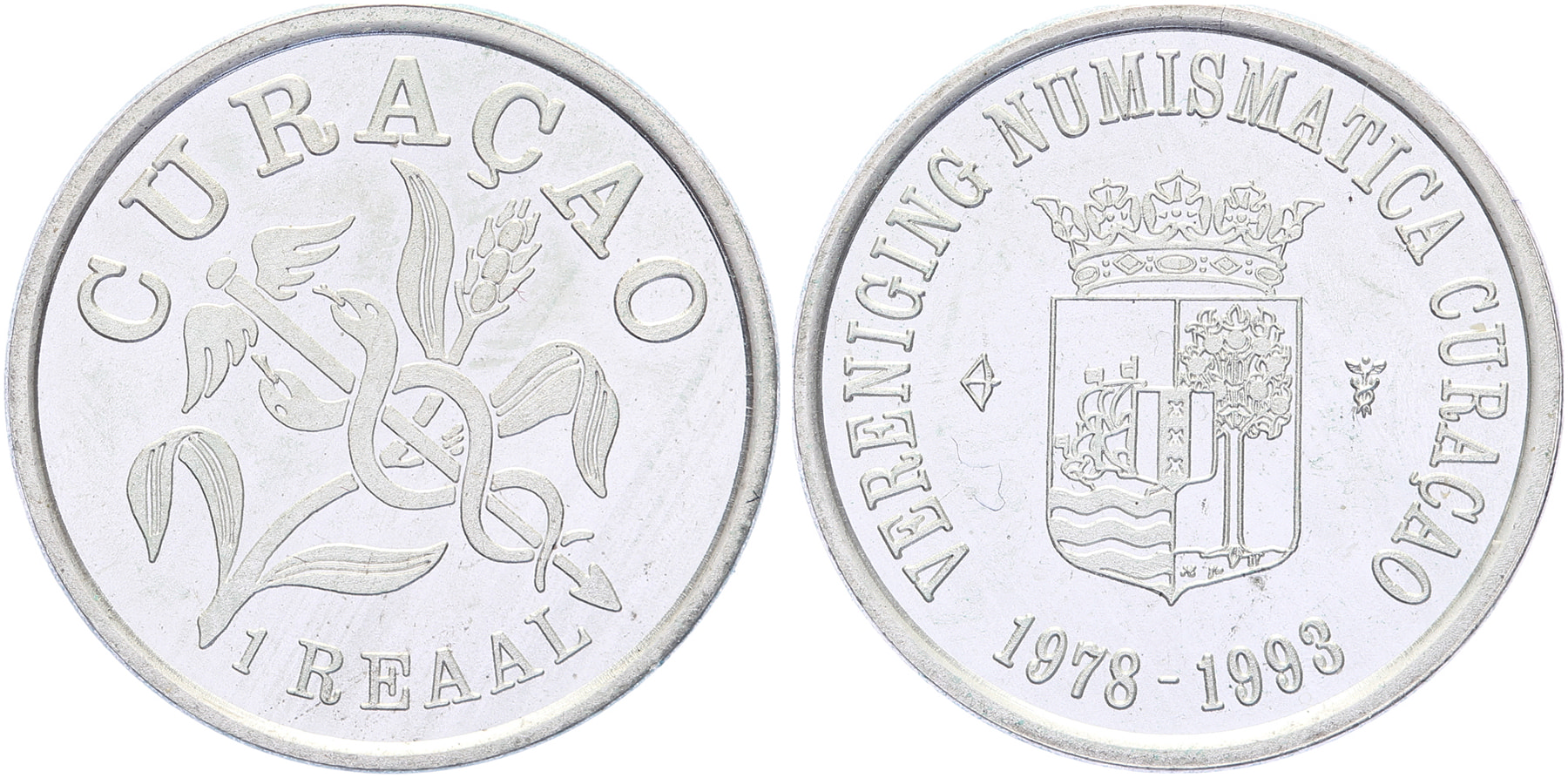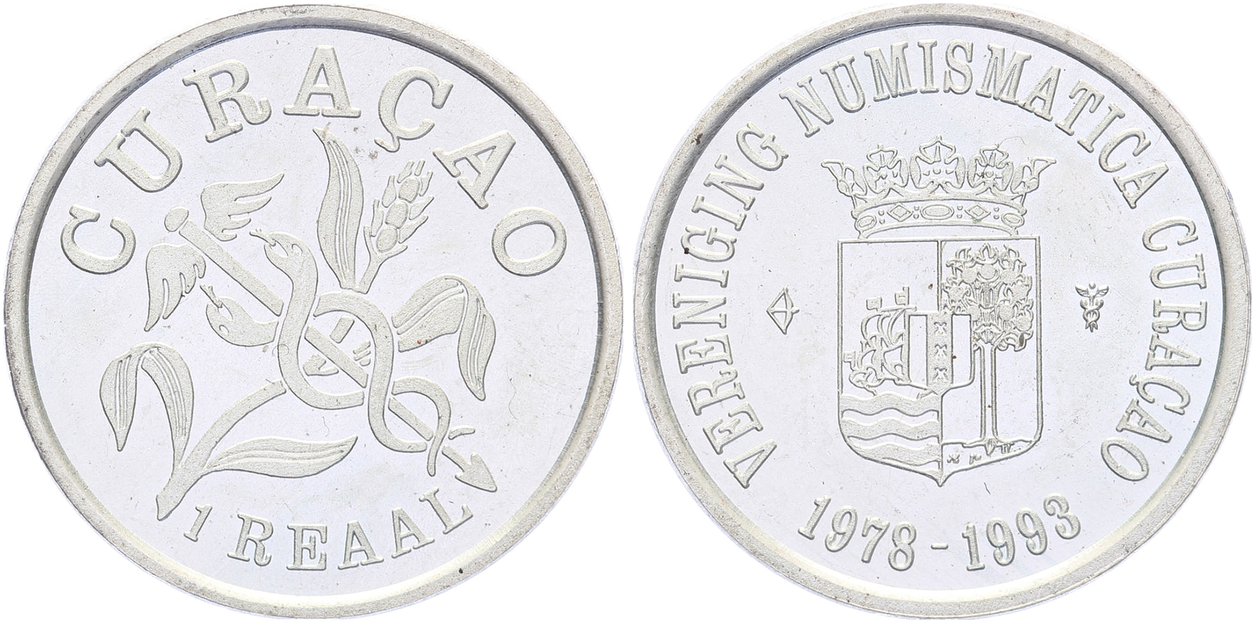 Lot (3) 1988. Tien jaar Vereniging Numismatica Curaçao. Imitatie van een Reaal 1821.AR 18 (2 ex., oplage 500) en AU 18 (oplage 60 ex.). FDC.