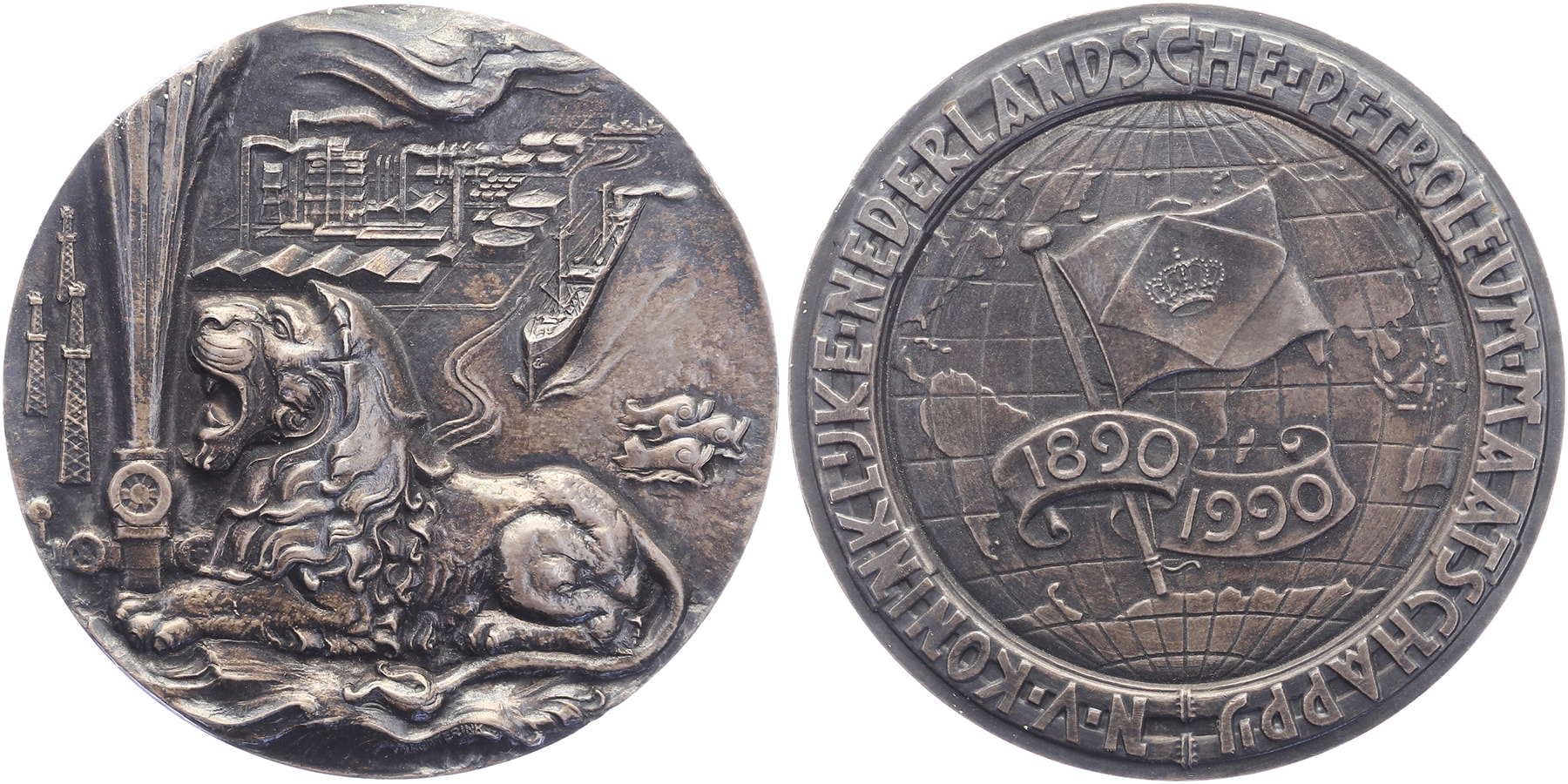 1990 Eeuwfeest Koninklijke Nederlandse Mij. tot Exploitatie van Petroleumbronnen in Nederlandsch-Indië. Naar links liggende leeuw bij spuitende oliebron; raffinaderij en tanker. / Aardbol met maatschappijvlag en vliegend lint met jaartallen. AR 75 [213 gram, 999/1000]. Vgl. KB V-1426. Marinus Kutterink & (Henk van Bommel). In houten cassette. Prachtig.