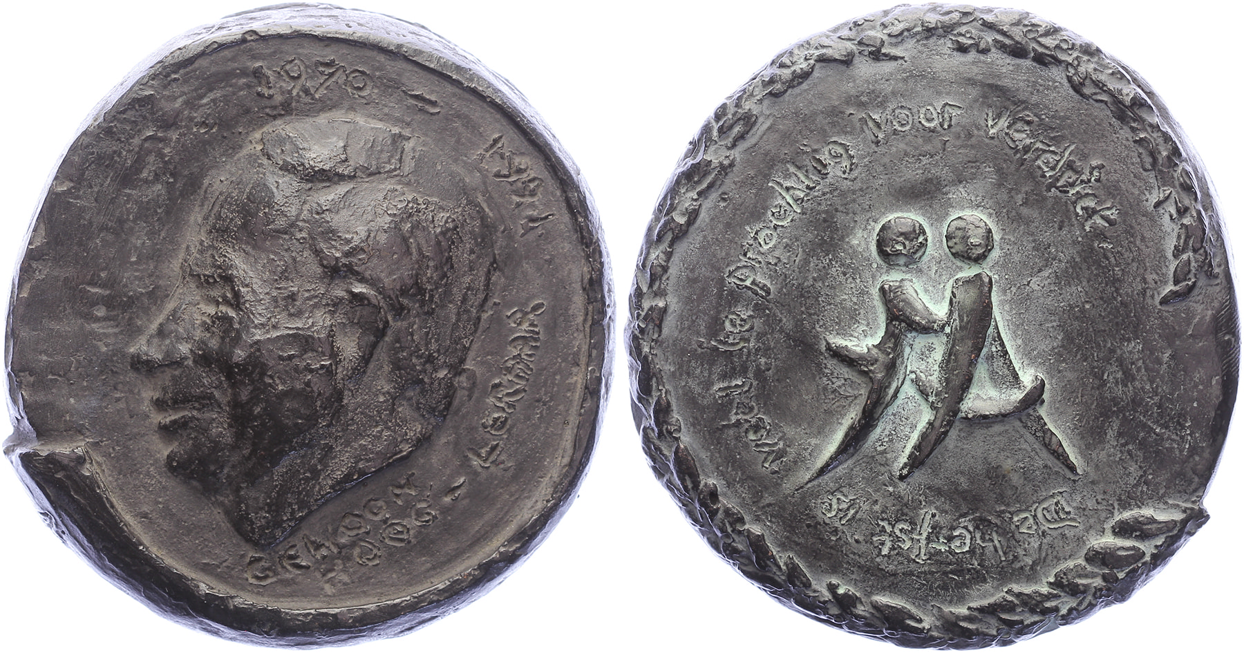 1991 De herfst is veel te mooi voor verdriet. Mannenhoofd naar links. / Twee dansende gestileerde figuren. Æ gegoten ca. 72. Geacon ? Zeer fraai.