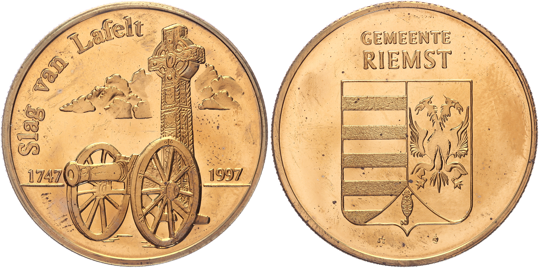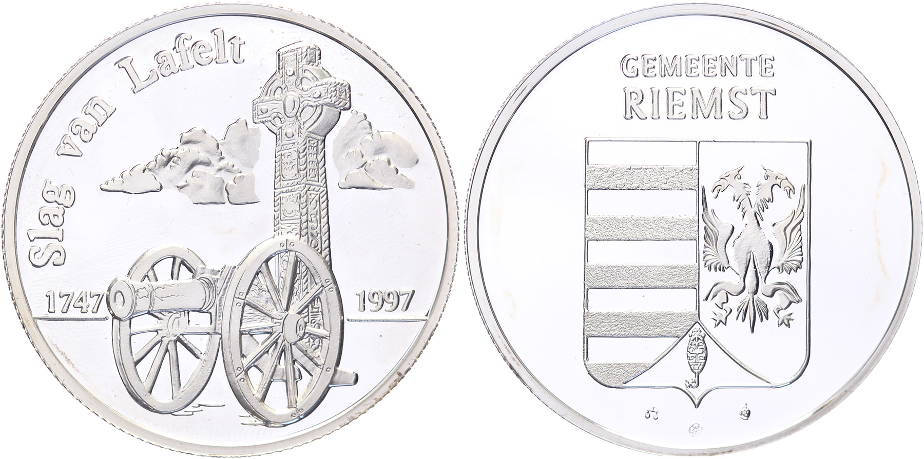 Lot (2) 1997 Slag van Lafelt voor 250 jaar. Iers kruis met kanon. / Wapen gemeente Riemst.Æ + AR [22,9 gram] 37. FDC.
