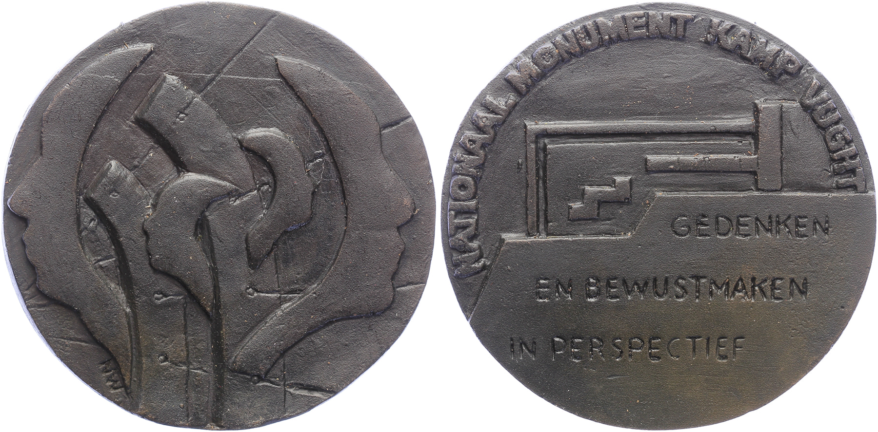 2002 Herinrichting en nieuwbouw Nationaal Monument Kamp Vught. Betonnen palen met gezichtsprofielen. / Plattegrond en tekst. Æ gegoten 95 [455 gram]. Netty Werkman. Prachtig.