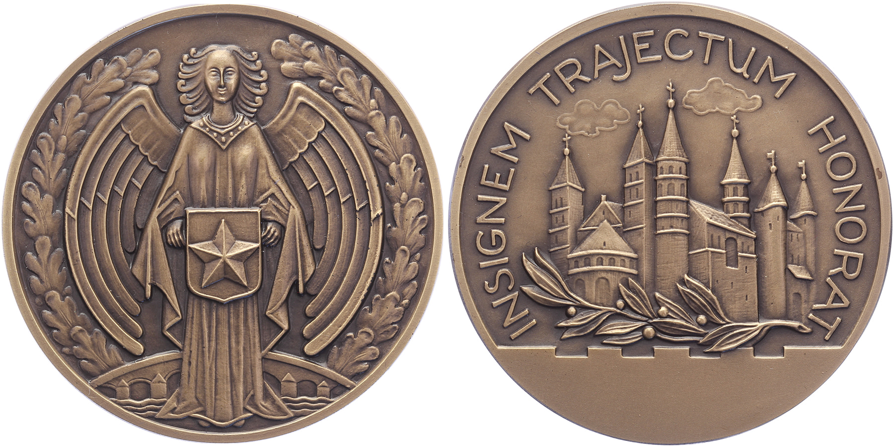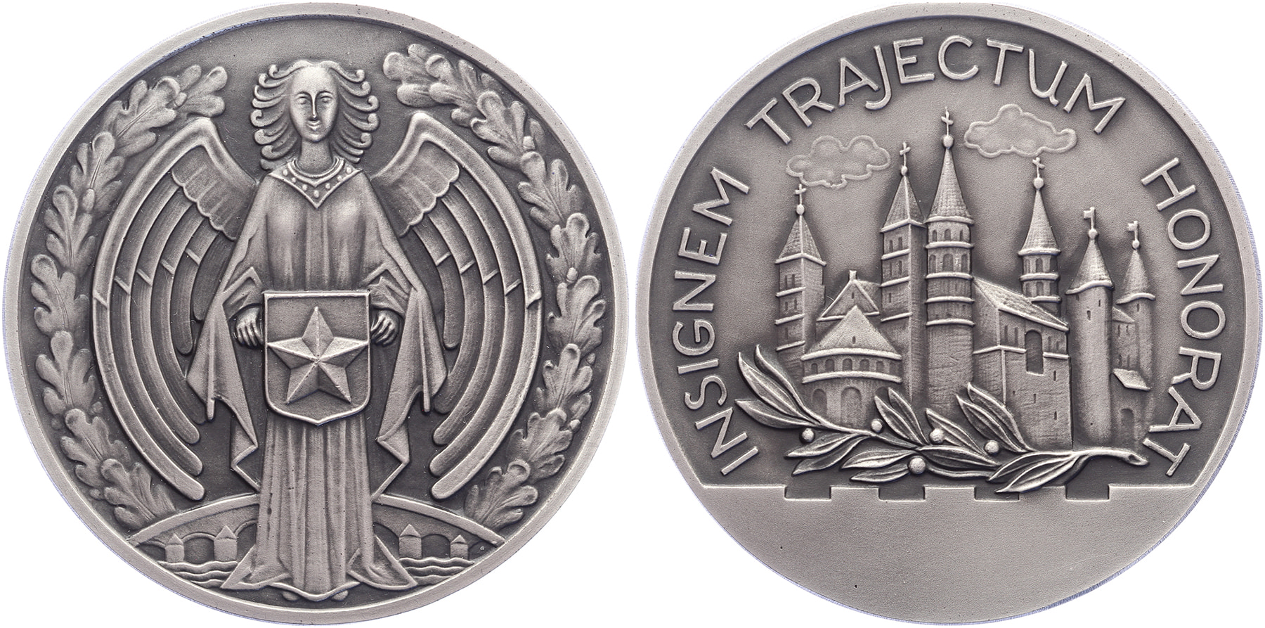 Lot (2) z.j. Maastricht Gemeentelijke erepenning. Stadsengel met (modern) wapen. / Kerktoren boven inscriptieruimte. Æ+ AR [98,32 gram, 925/1000] 60. Prachtig / FDC.