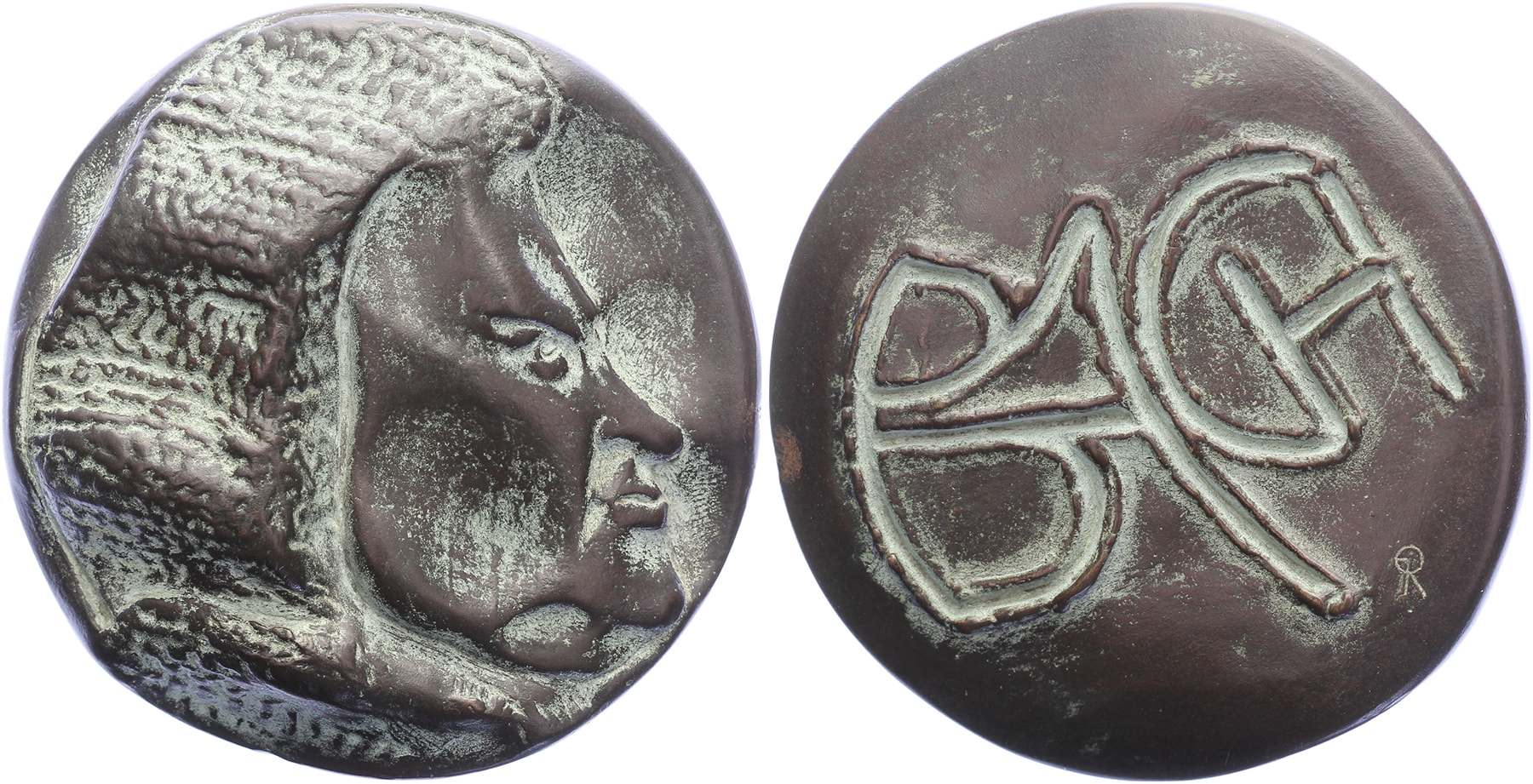z.j. Johann Sebastian Bach. Portret naar rechts. / Achternaam in gestileerde letters.Æ gegoten ± 90. Jos Reniers. Prachtig.