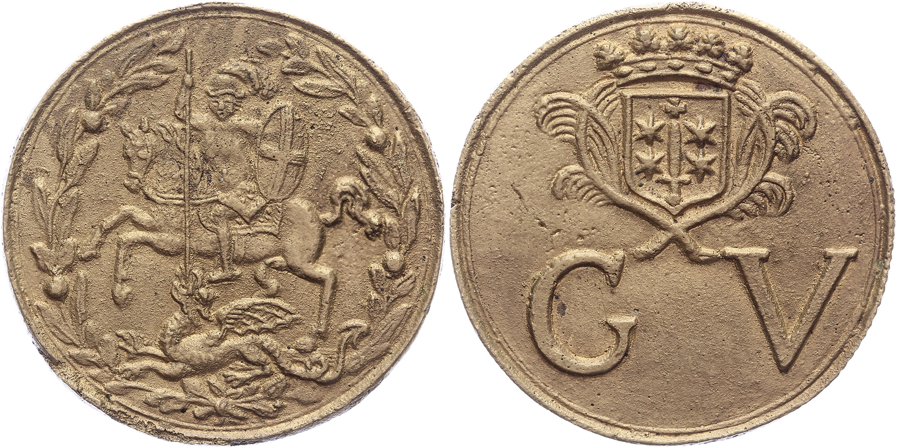 z.j. (17e eeuw). Schutterspenning St. Jorisdoelen, Gekleurde Vaandel. St. Joris te paard in gevecht met de draak. / Gekroond wapenschild, daaronder de letters G V zonder gildenummer.Messing gegoten 49. JMP 1916, pag. 92, nr. 463. Vrijwel prachtig.