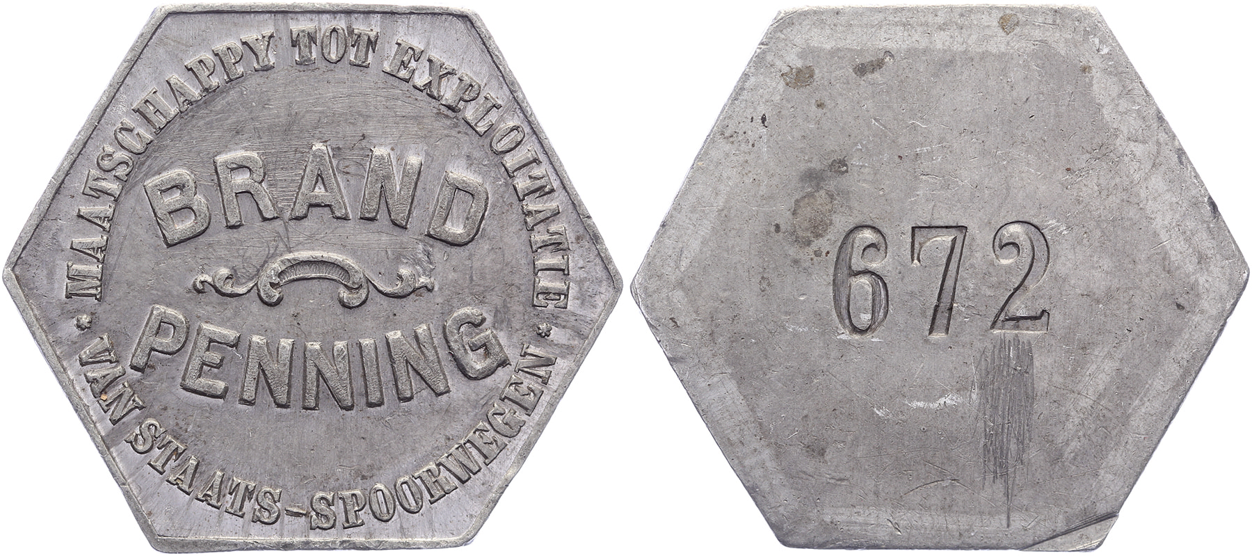 z.j. (1870-1938) Brandpenning Mij. tot Exploitatie van Staats-Spoorwegen.Tin, zeshoekig 41,5 x 41,5 x 41,5. Ingeslagen nr. 672. Curieuze penning; tot nu toe zijn de nrs. 57, 65, 598 en 1041 bekend. Prachtig.