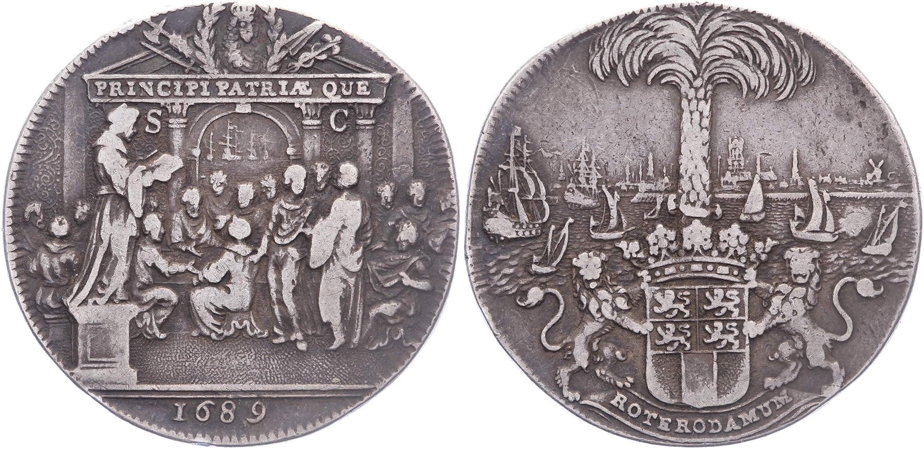 1689 Vroedschapspenning op de kroningsfeesten. Gezicht op het feestmaal bij standbeeld Erasmus; daarboven borstbeeld Willem III. / Stadsgezicht met schepen op de Maas, palm en Stadswapen op voorgrond. AR 31 [9,6 gram]. vL III-420; Dugniolle 4558. Bijna zeer fraai.
