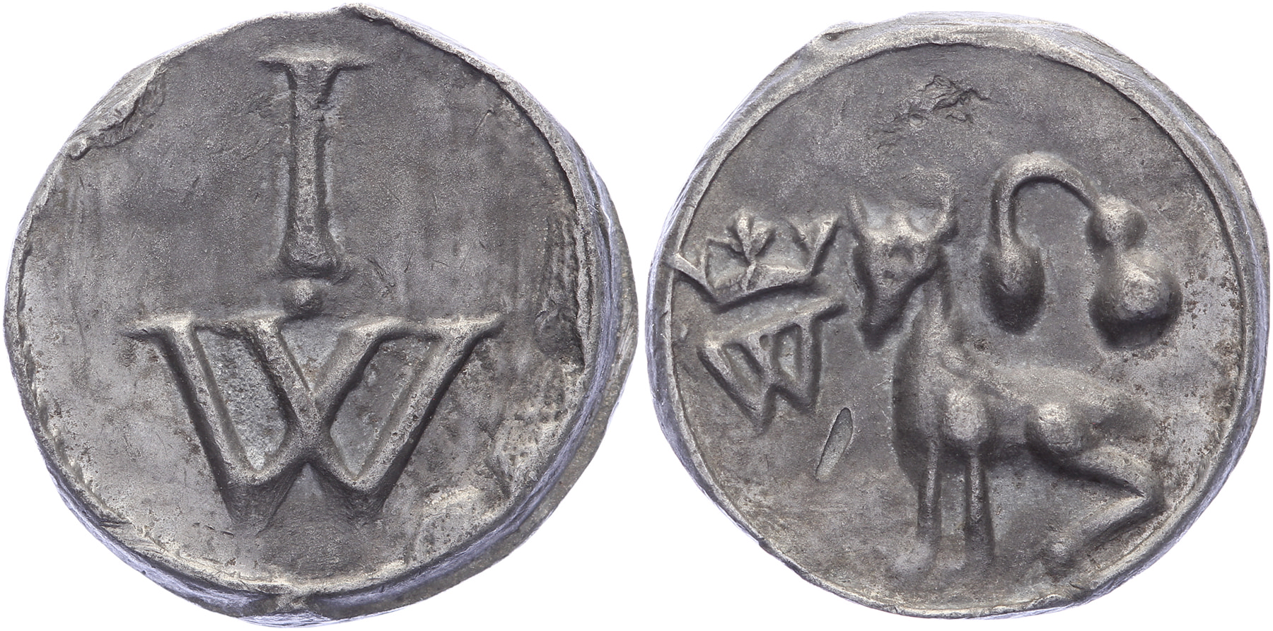 z.j. Zittend dier met hoorns bij gekroonde W en een soort bel. / letter I. W.Lood 22,6. Mogelijk een bierbrouwerspenning voor wit bier (?). Prachtig.