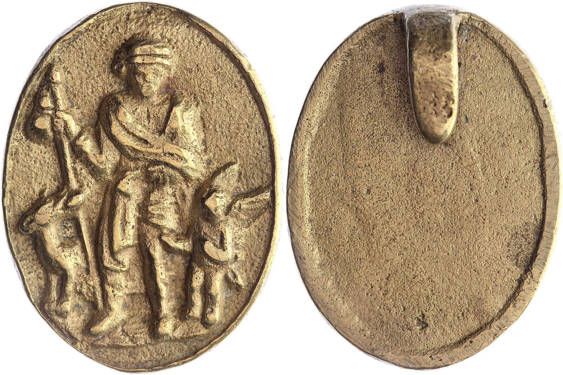 z.j. Staande man, pover gekleed, met staf tussen hertje en gevleugeld kind. / Blanco met gesp.Messing gegoten, ovaal, 40 x 30. Zeer fraai.