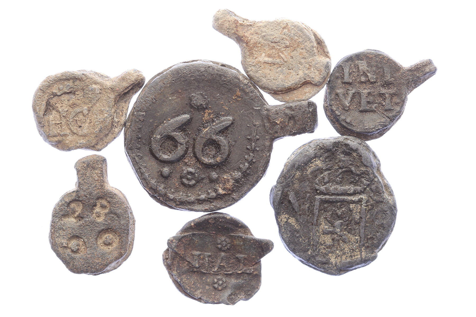 Lot (7) loodjes. Bodemvondsten. Leuk priegelwerk.