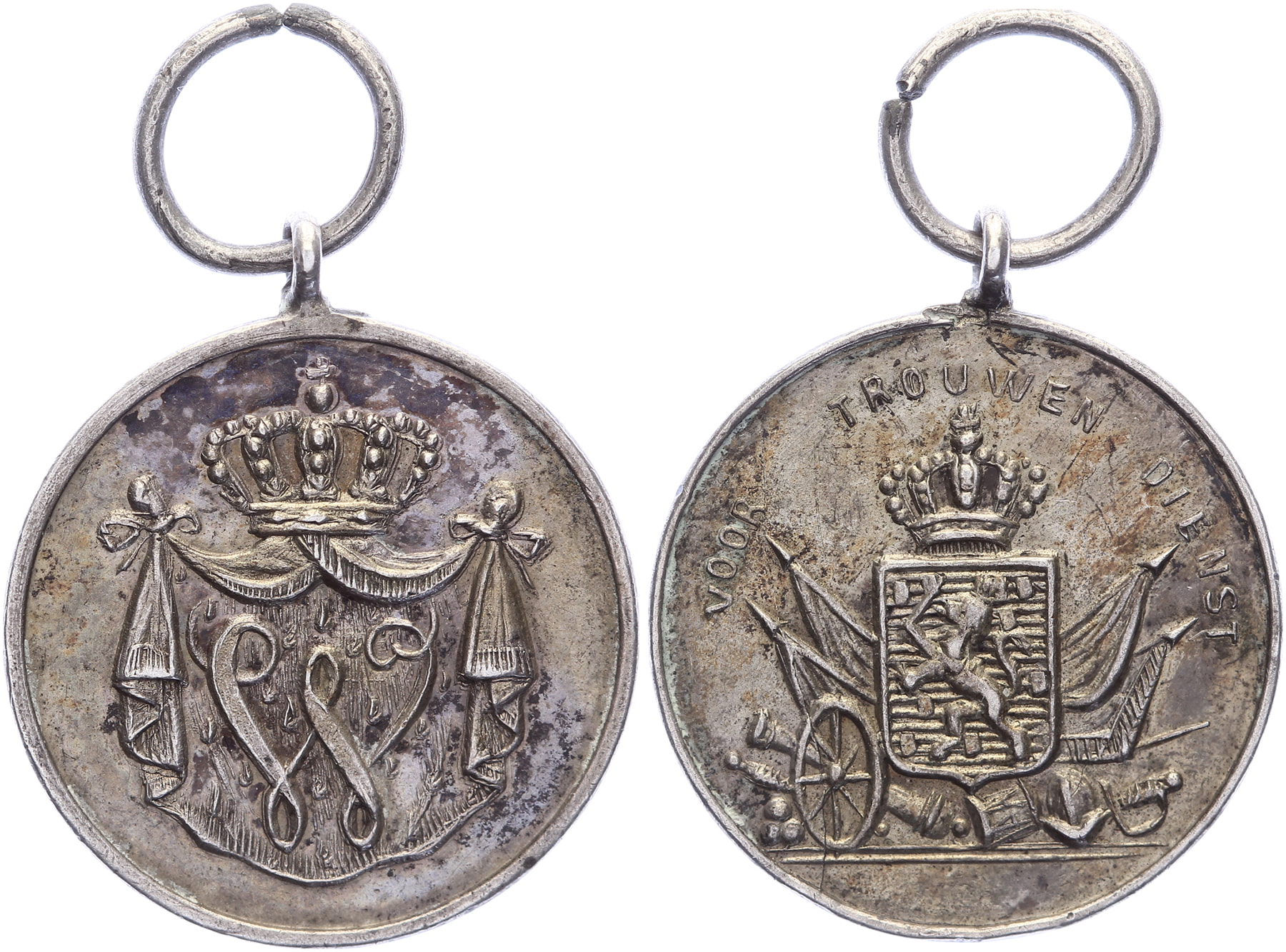z.j. Miniatuur draagmedaille voor trouwe dienst bij de landmacht. Koninklijke mantel waarop “W”. / Rijkswapen rustend op militaire zinnebeelden. AR 21. Vgl. Bax 3.2. Zeer fraai.