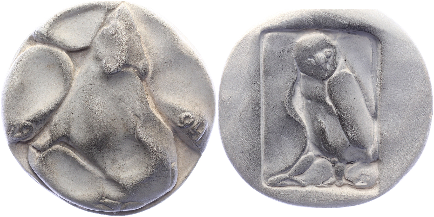 1994 Jaarpenning Muis. Snuffelend muisje. / Spiedende uil.Terracotta geperst ca. 74, grijsachtig. De Beeldenaar 1994, pag. 87. Prachtig.
