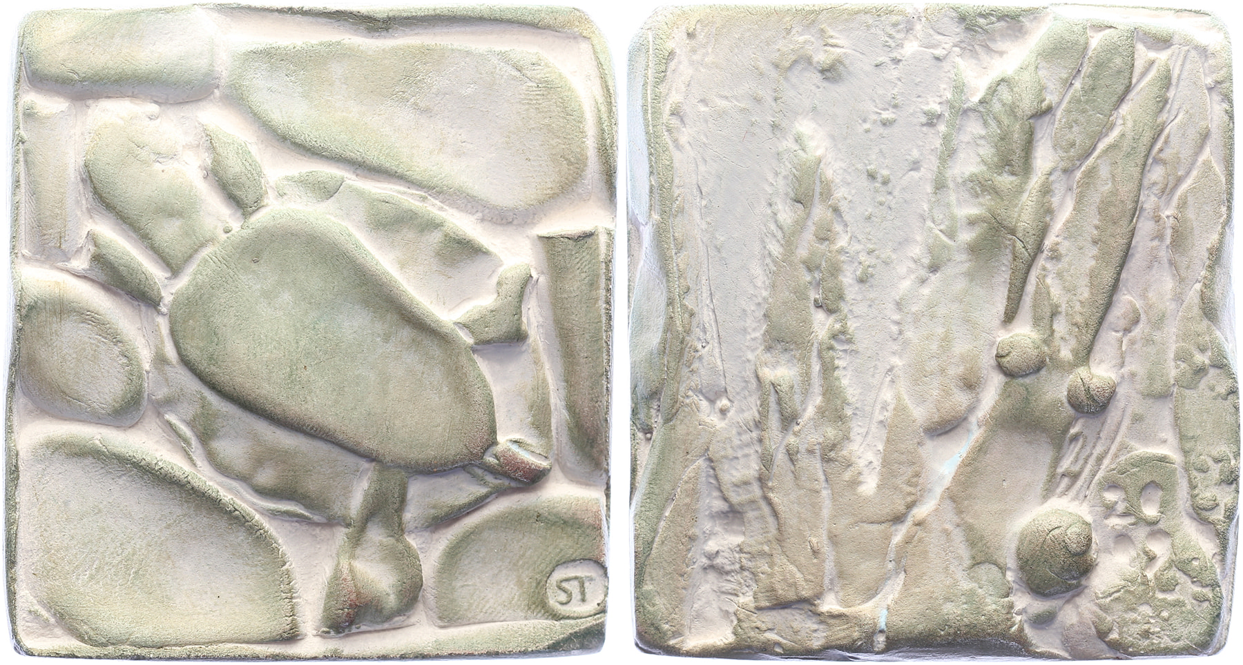 2009 Jaarpenning Schildpad. Zwemmende schildpad van bovenaf gezien. / Waterplanten met slakken. Terracotta geperst 66 x 72, lichtgroen. De Beeldenaar 2010, pag. 76. Prachtig.