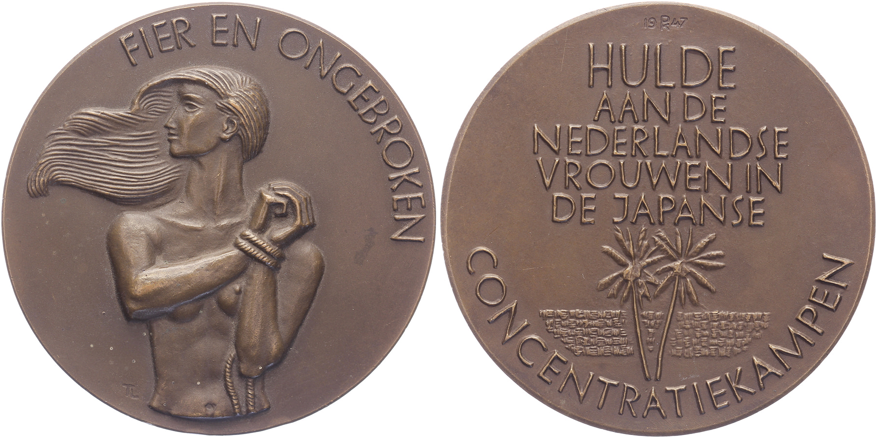 1947 Japanse vrouwenkampen. Geboeide vrouw met wapperend haar. / Palmbomen voor muur.Æ 60. Tilanus p. 191-193. Titus Leeser. Prachtig.