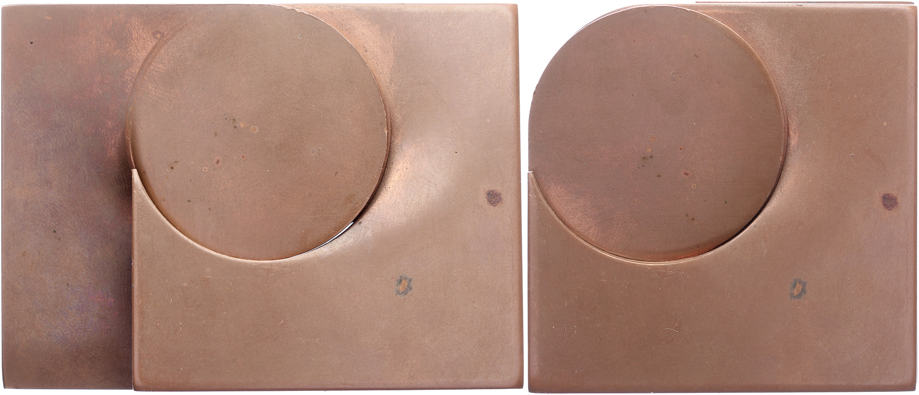 1980 Vierkant met cirkel in hoek. Twee bijna identieke vierkanten met uitgesneden cirkel.Roodkoper 60 x 60. Tilanus p. 403-405. Lijsbeth Teding van Berkhout. Prachtig.