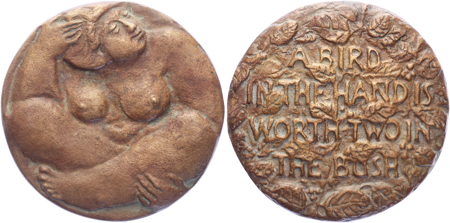 1980 A bird in the hand is worth two in the bush. Vlakvullend vrouwenlichaam. / Tekst binnen gebladerte. Æ gegoten 60. Tilanus p. 407-409. Theo van de Vathorst. Prachtig.