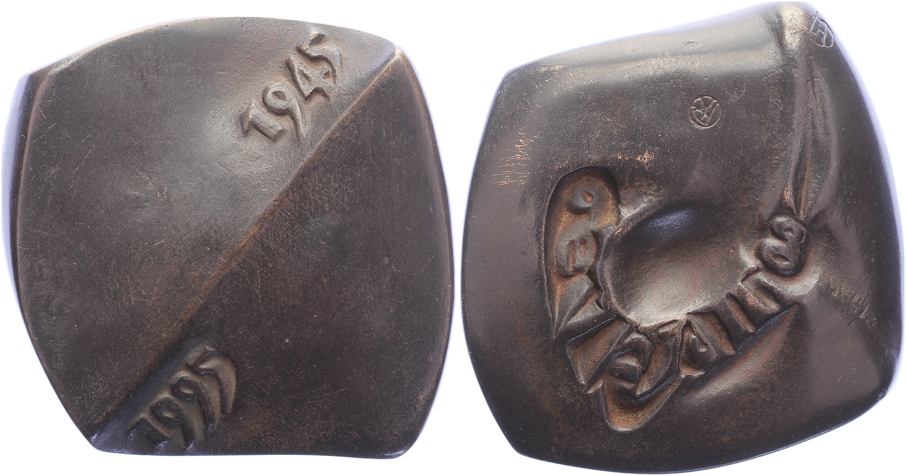 1995 50 jaar bevrijding. Twee vlakken met jaartallen. / Woord ‘bevrijding’ in halve cirkel.Æ gegoten 95 x 100. Tilanus p. 523-525. Hanneke van Mols-van Gool. Prachtig.