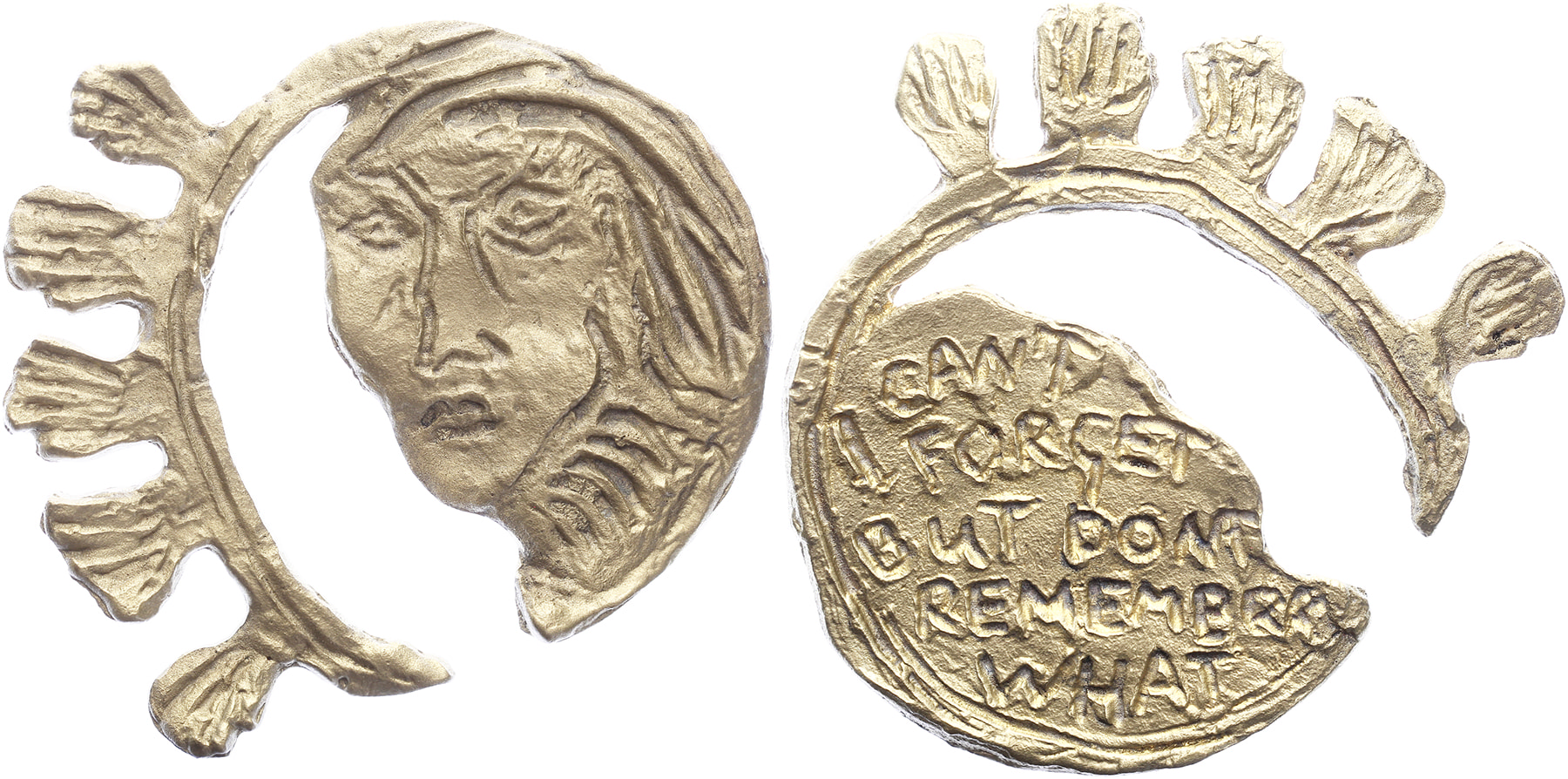 1996 I can’t forget hut I don’t remember what. Vrouwengezicht met vijf bladmotiefjes. / Tekst. Messing gegoten 100. Tilanus p. 535-537. Karel Goudsblom. Prachtig.