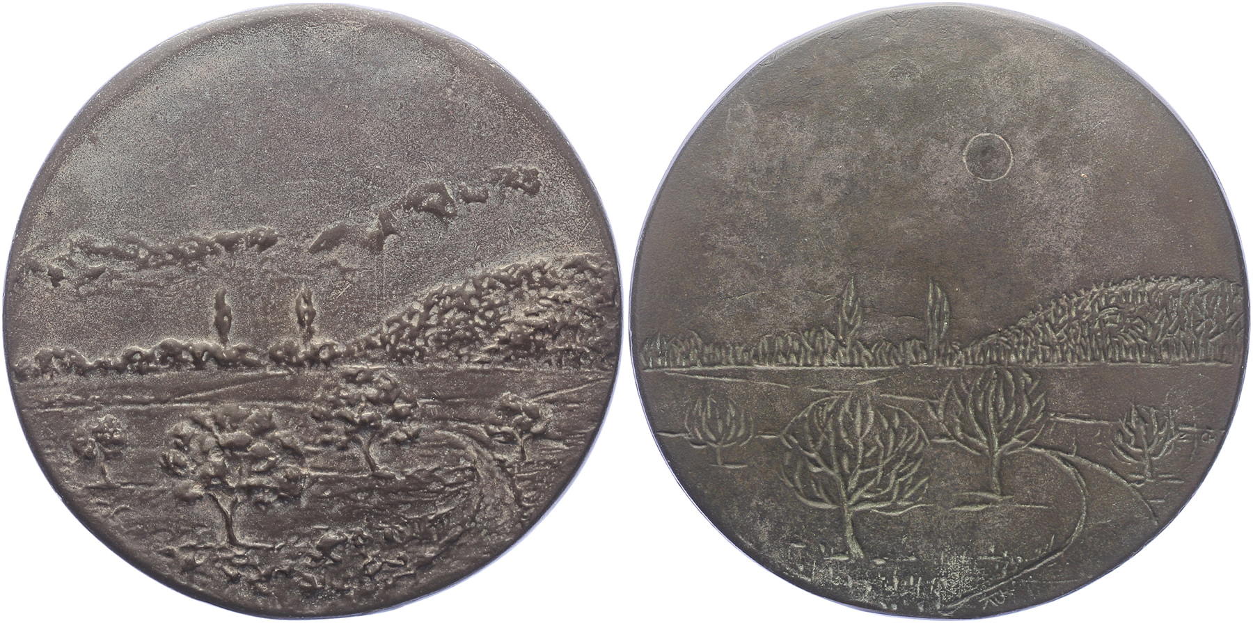 2002 Zomer-Winter. Landschap met wolken. / Hetzelfde landschap in wintertooi.Æ gegoten 82. Christl Seth-Höfner. Prachtig.