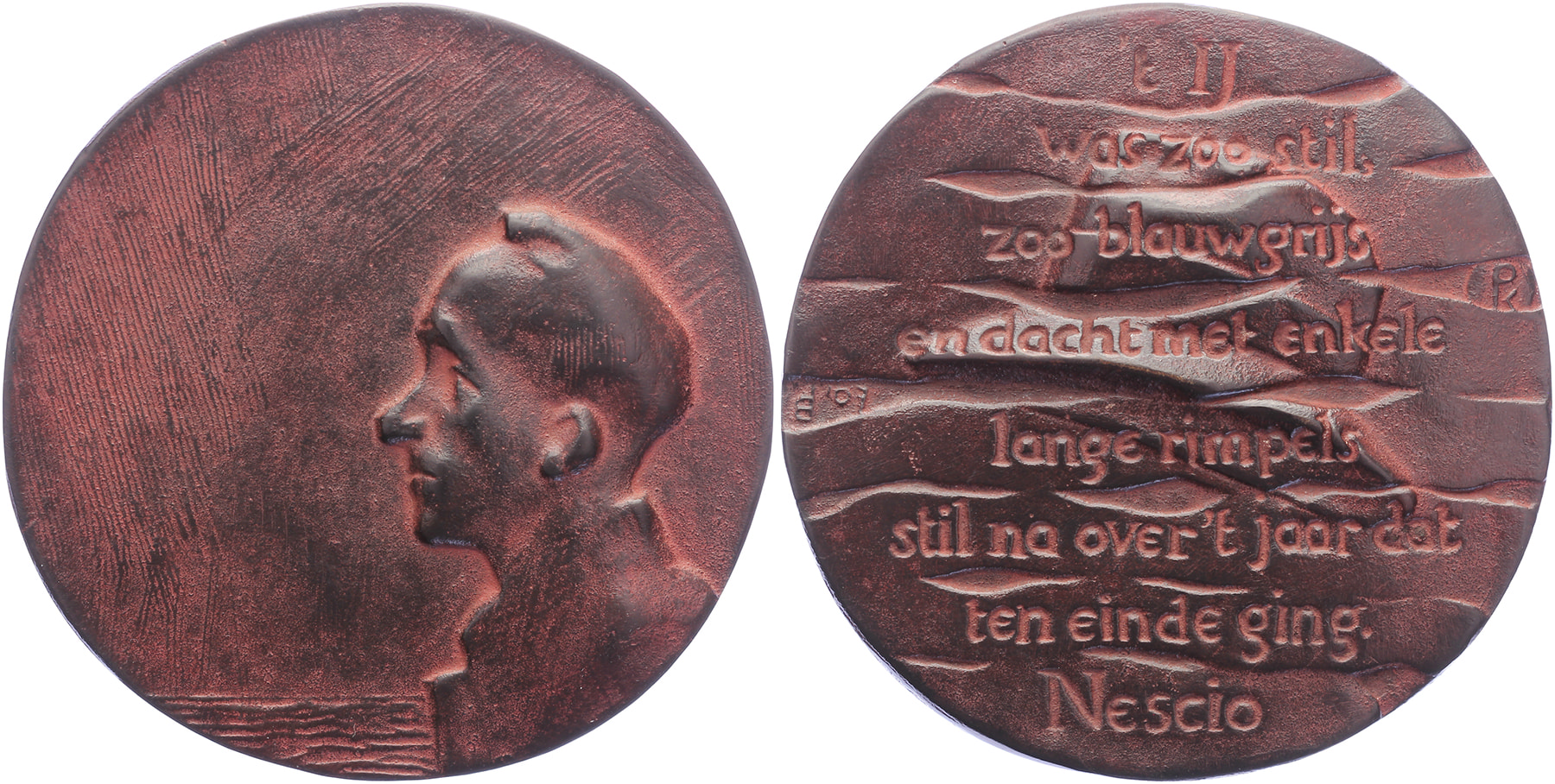 2007 Nescio (J.H.F. Grönloh). Hoofd naar links op bewogen font. / Achtregelig opschrift.Æ gegoten 90. Da van Daalen. Prachtig.