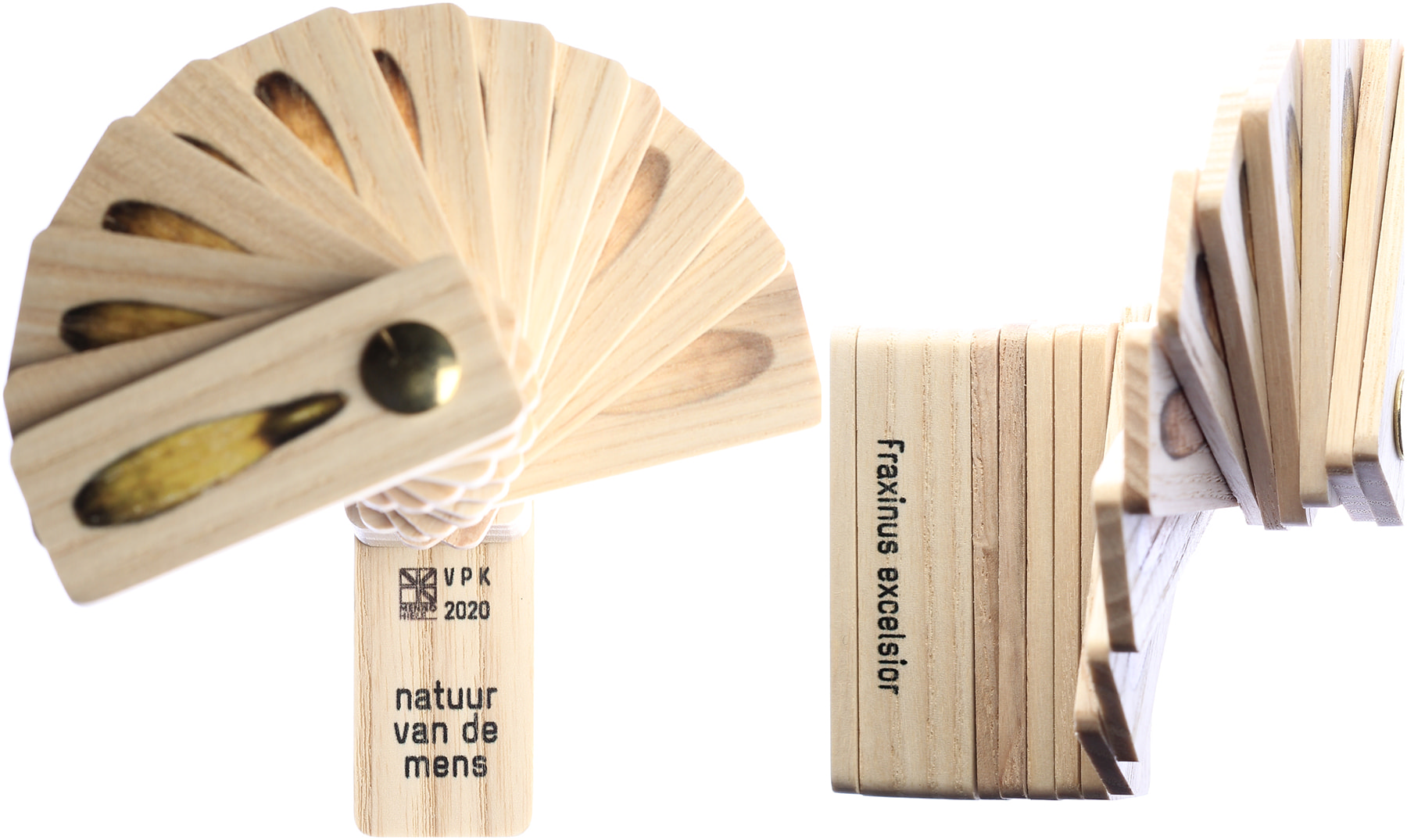 2020 Natuur van de mens. Houten penning waar alle onderdelen als een waaier kunnen uitvouwen. Essenhout 65 x 52. Menno Hiele. Prachtig.