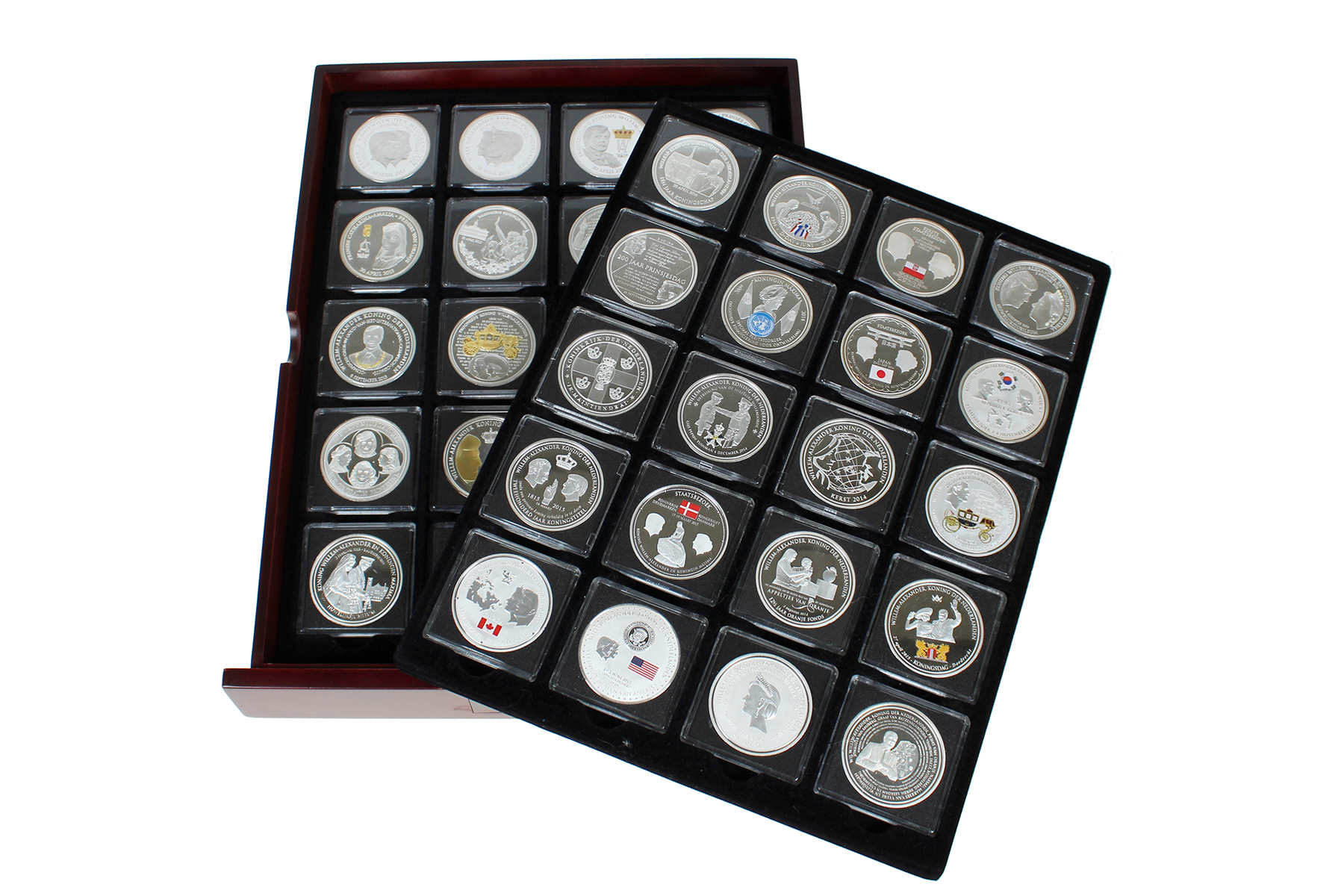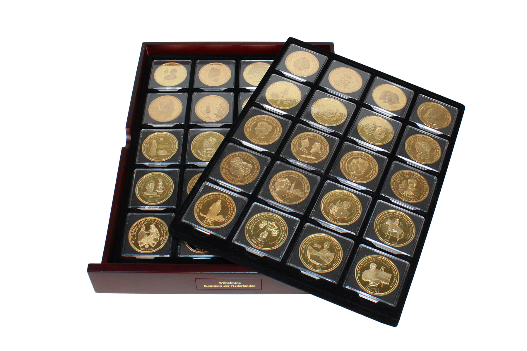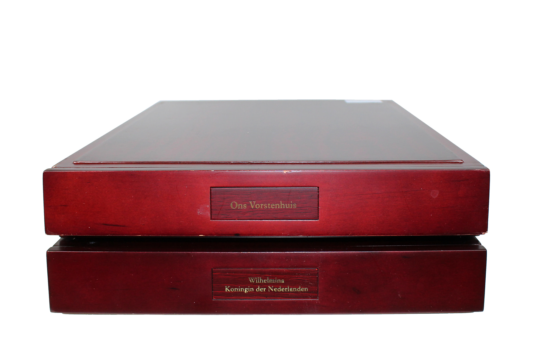 Twee luxe kisten met het summum van bling bling. 80 stuks goud en zilver vergulde penningen m.b.t. ‘Ons Vorstenhuis’ en ‘Wilhelmina Koningin der Nederlanden’.