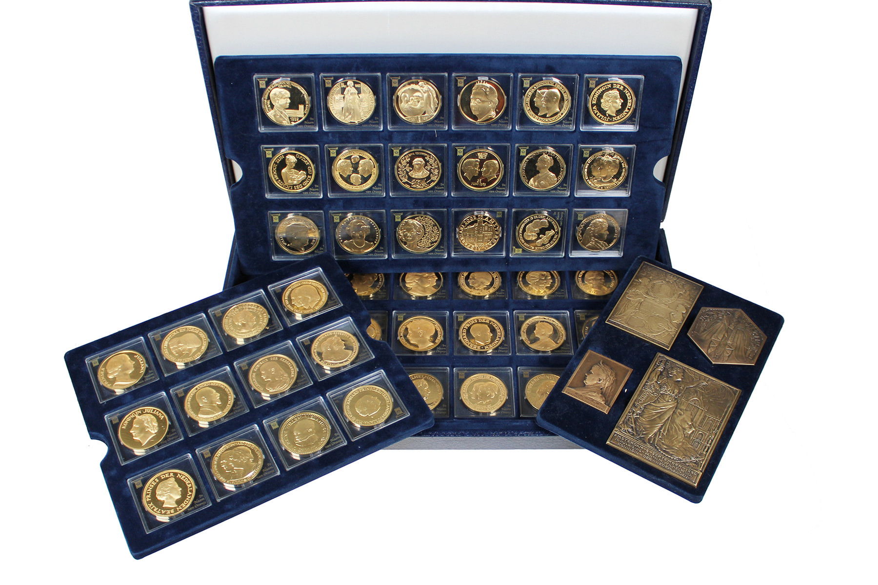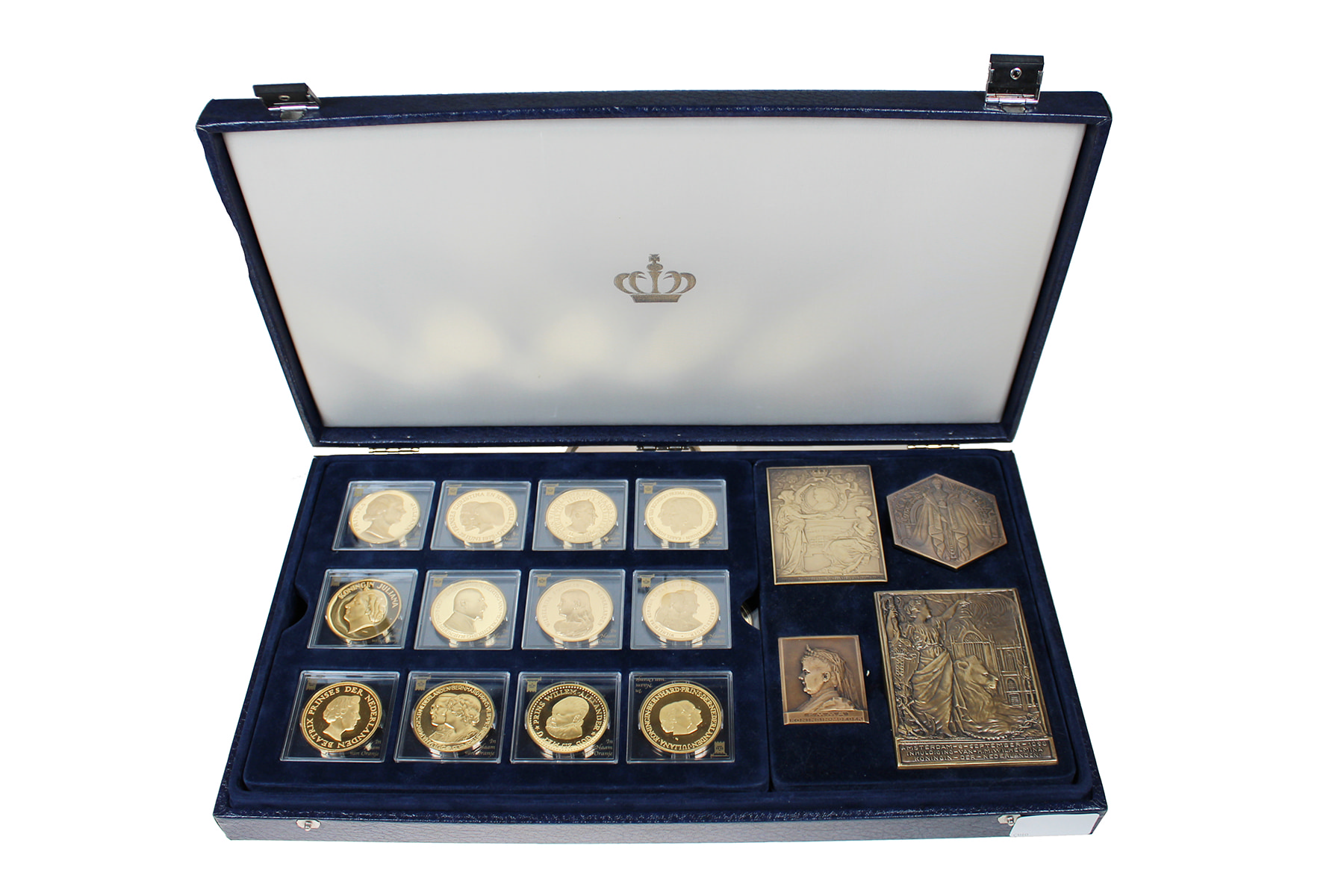 Blauwe cassette met 48 stuks goud vergulde penningen m.b.t. het koningshuis uit de categorie bling bling.