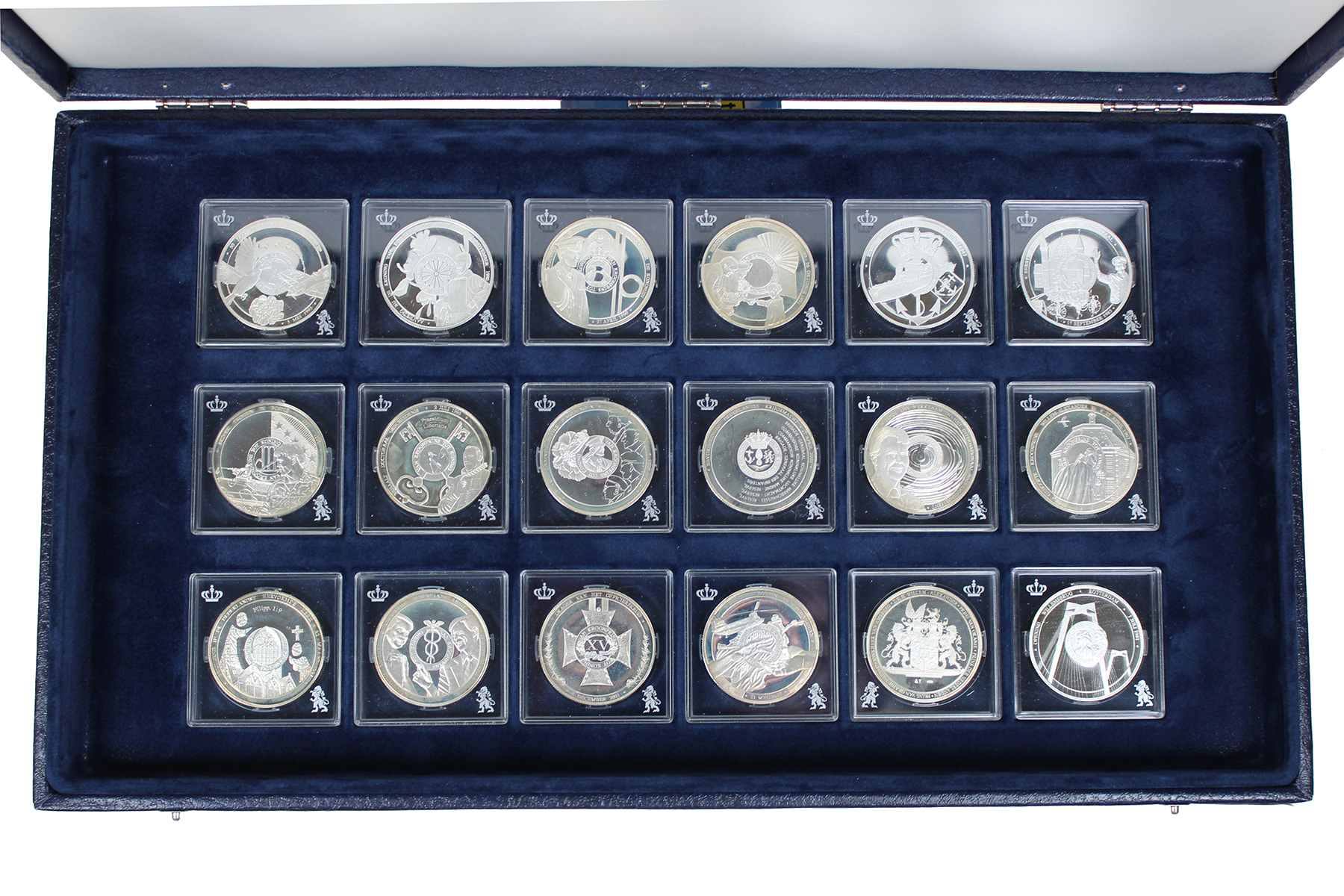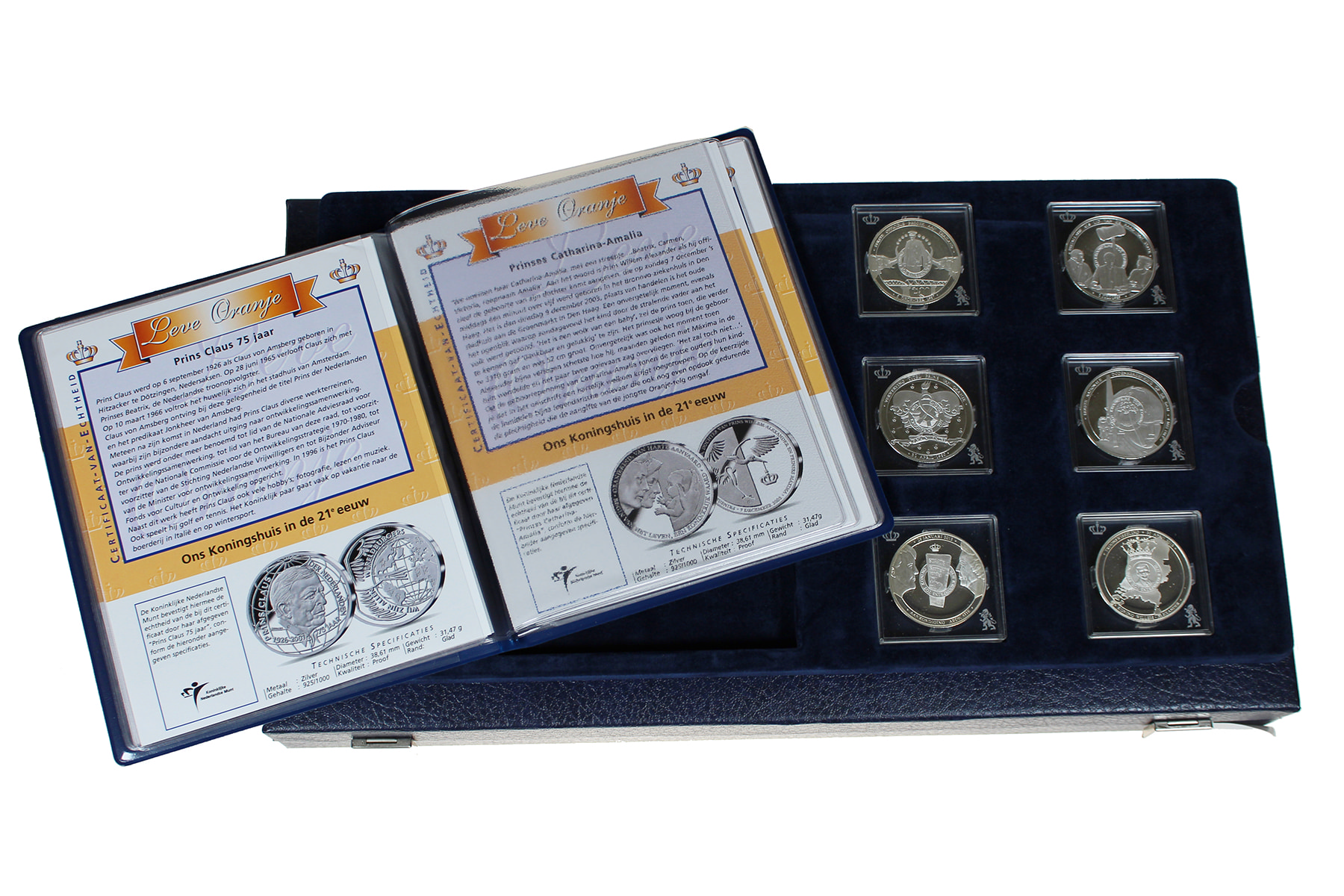 Blauwe cassette met 24 stuks sterling zilveren penningen, o.a. uit de serie Leve Oranje! Ruim 750 gram bruto AR.