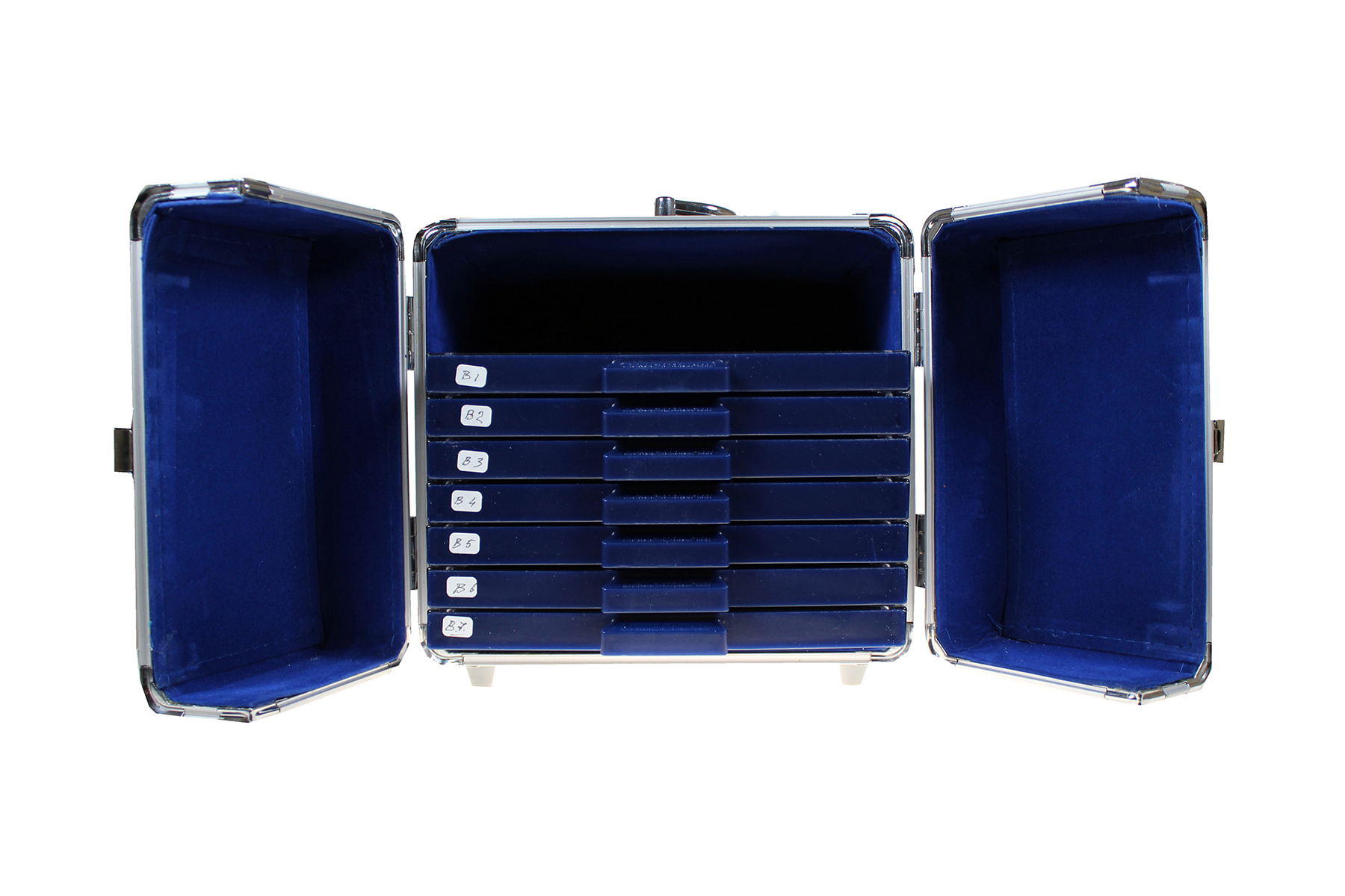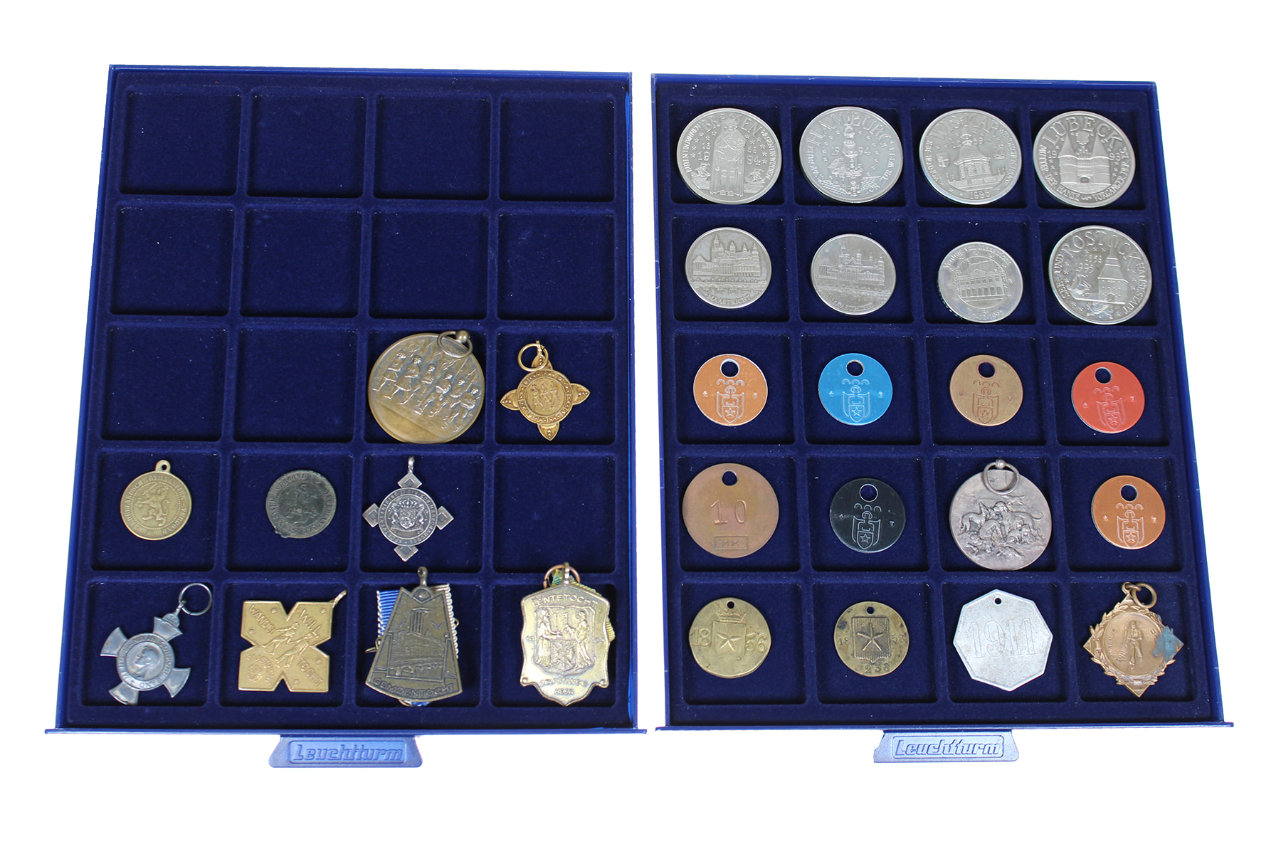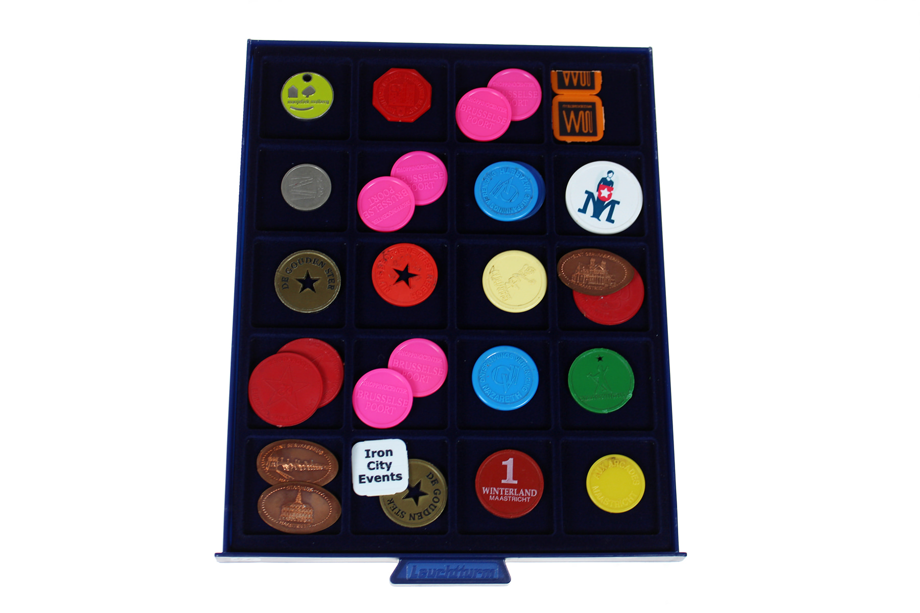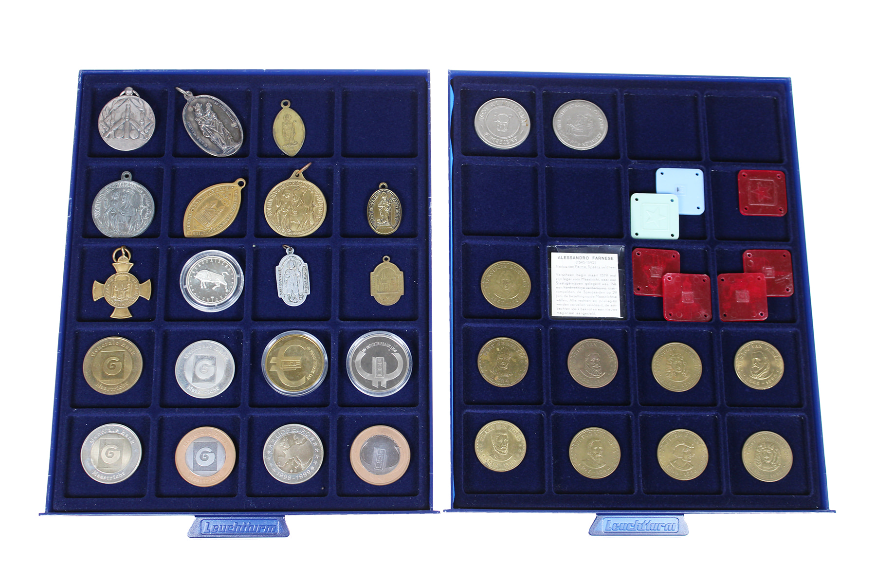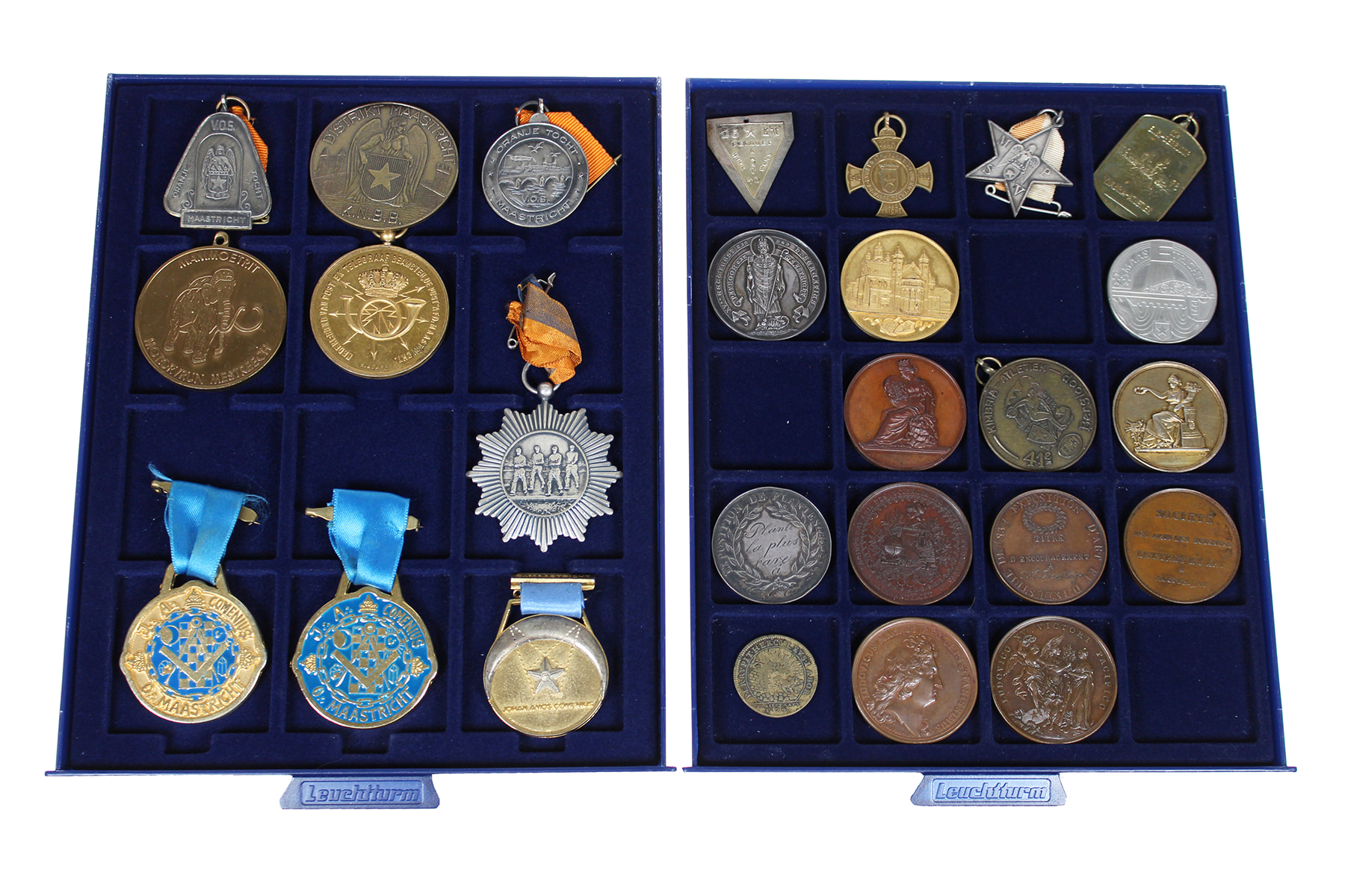 Zilverkleurig muntkoffertje met 120 diverse penningen betr. Maastricht, w.o. sportpenningen, reclamepenningen, hondenpenningen en leuke bronzen stukken. Bezichtiging aanbevolen!