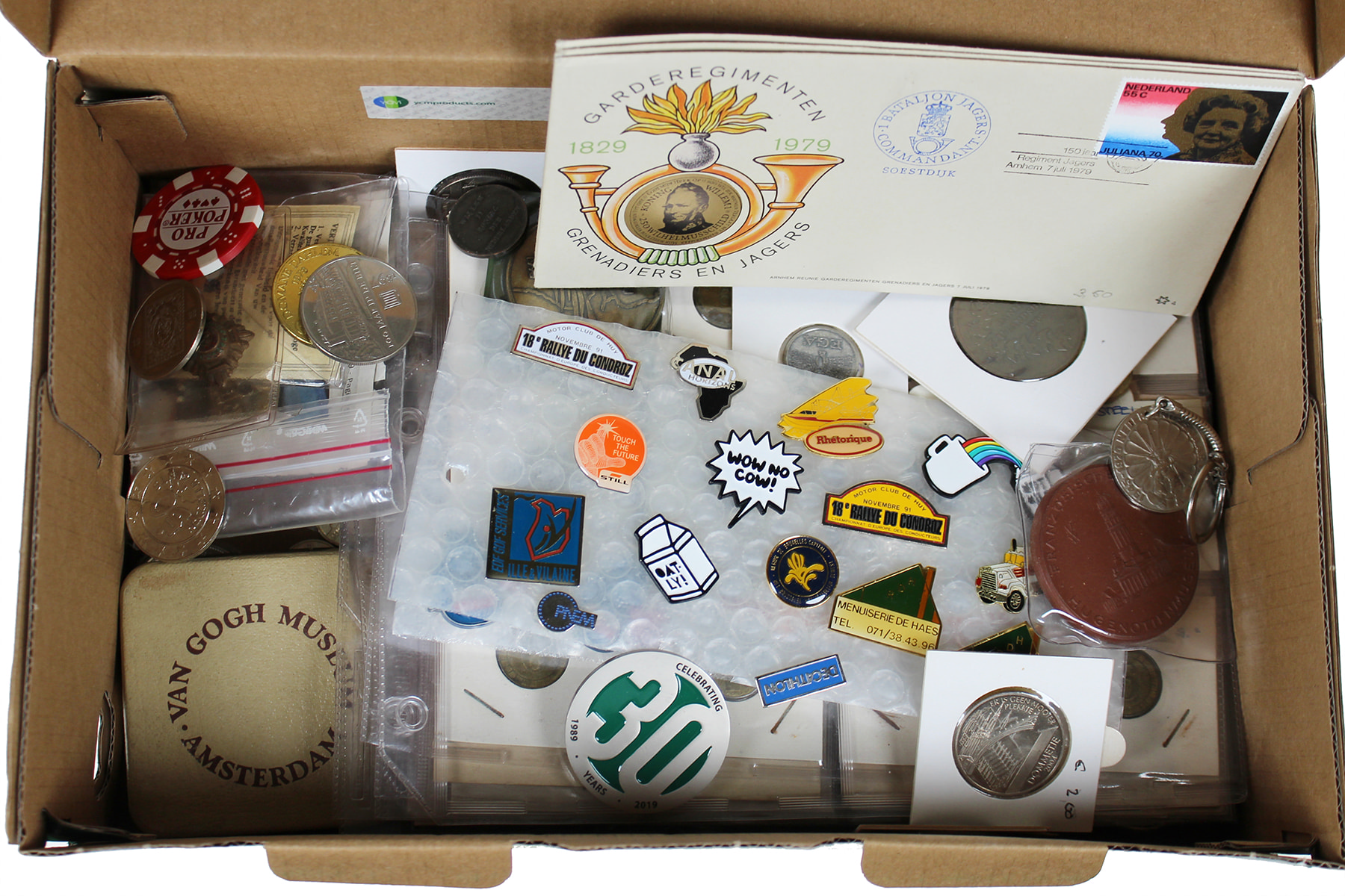 Schoenendoos diverse penningen e.a. memorabilia. Zeer divers.