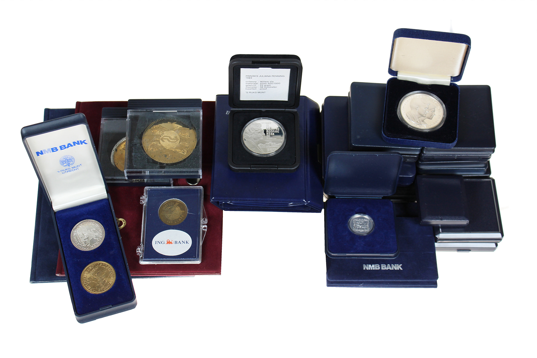 Bruine doos met allerlei penningen in cassettes, ook zilver.