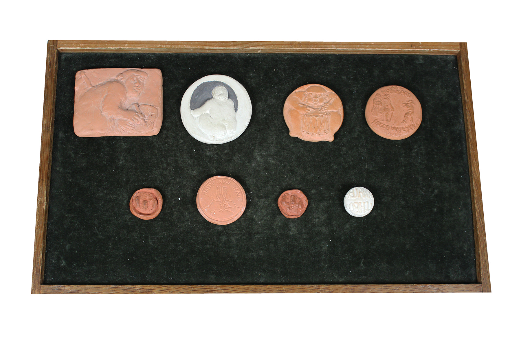 Doosje met acht terracotta penningen van Theo van de Vathorst; proeven, afgietsels en voorstudies. O.a. nieuwjaars penningen. Interessant studieobject.
