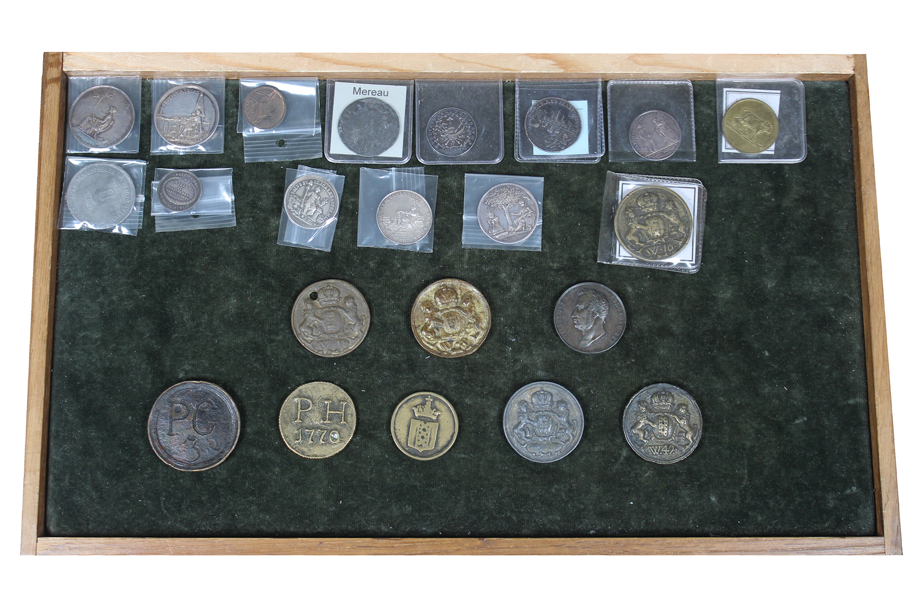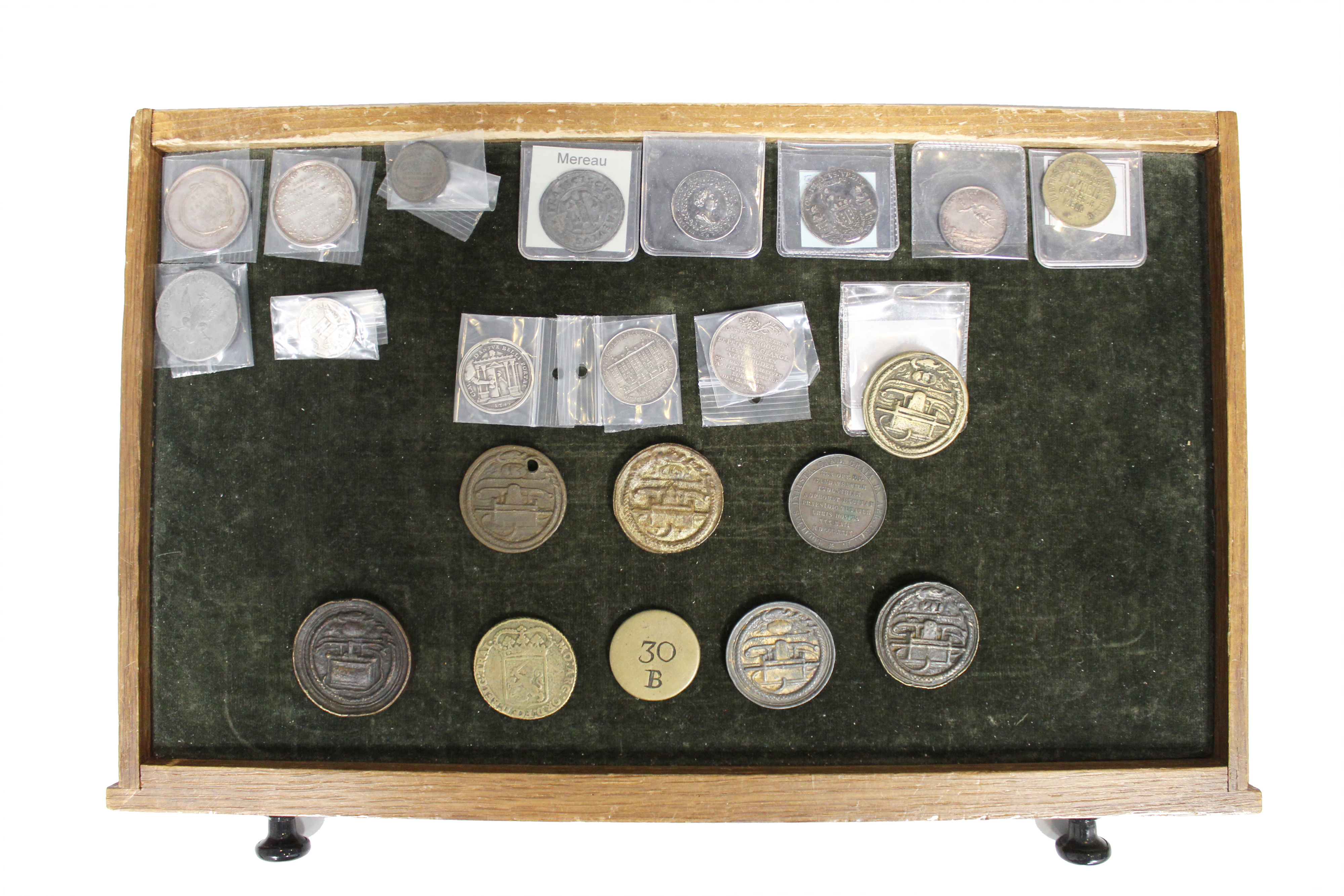 Doosje (22) divers, w.o. brandweerpenningen Amsterdam en klein zilver 18e / 19e eeuw.
