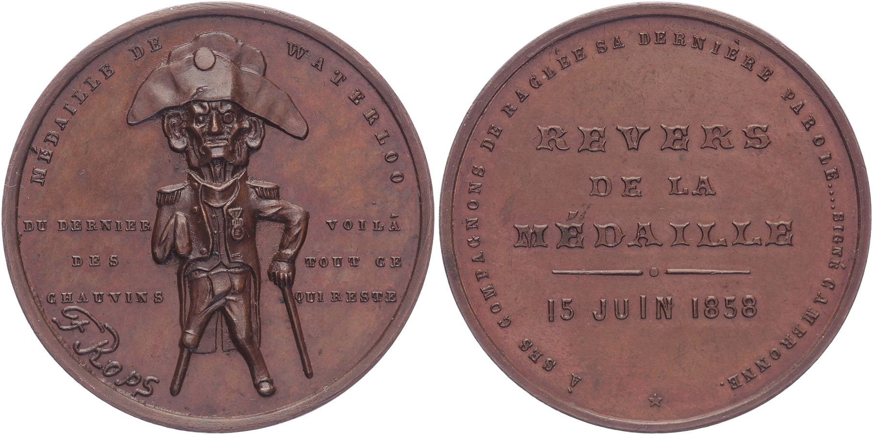 1858 Satirische penning Slag bij Waterloo. Oude man met houten been, wandelstok en Napoleonhoed. / Tekst. Æ 35,5. Félicien Rops. Prachtig / FDC.