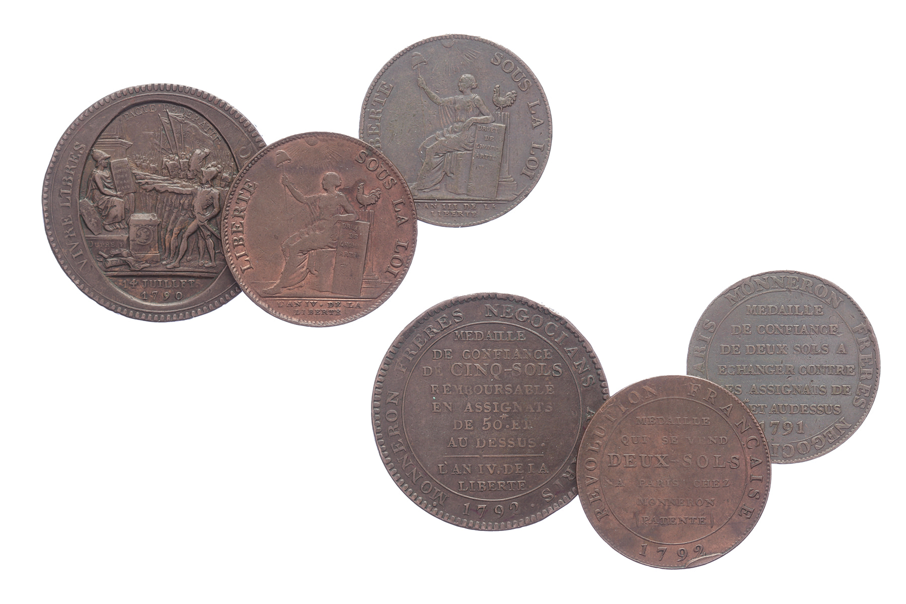 Lot (3) 1791/1792 Monneron Frères: 2 Sols 1791 & 1792; 5 Sols 1792.KM Tn23; Tn25; Tn31. VF.