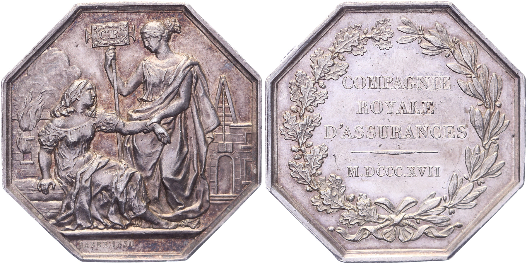 1817 Compagnie Royale d’Assurances. Standing Providence aids a woman. / Text.AR octagonal 36,5. Gailhouste 758/264; Barre 1830. EF.