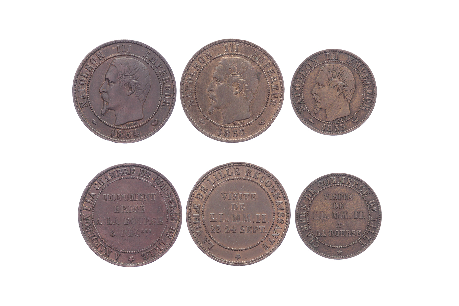 Lot (3) 1853/1854 Lille, visit Napoleon III. Æ 25 (5 Centimes) & 2 x 30 (10 Centimes).KM M23, M24, M25. VF & EF.