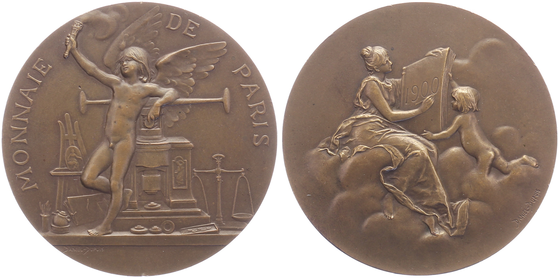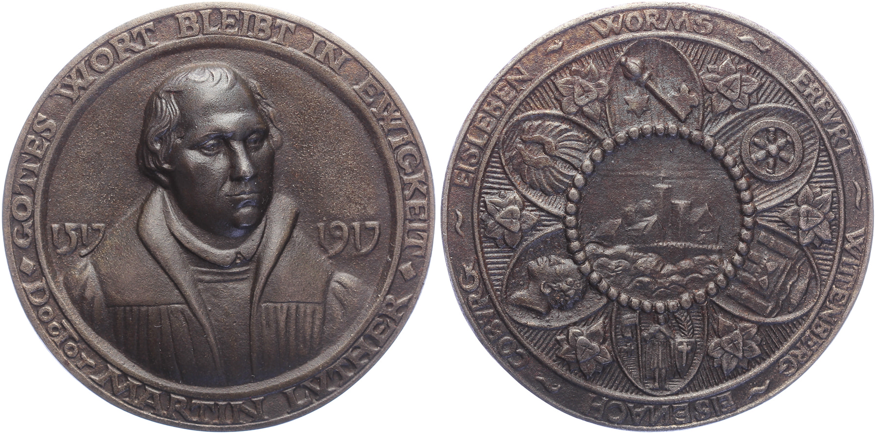 1917 Medaille anlässlich des 400. Jubiläums von Luthers Thesenanschlag. Brustbild Luthers von vorne. / In der Mitte die Wartburg im Perlenkreis, umgeben von Wappenschilden von Worms, Erfurt usw Eisenguss 70. Schnell 364. (Georg Römer). Vorzüglich. Hinzugefügt: Bronzemedaiile Monnaie de Paris, Æ50.