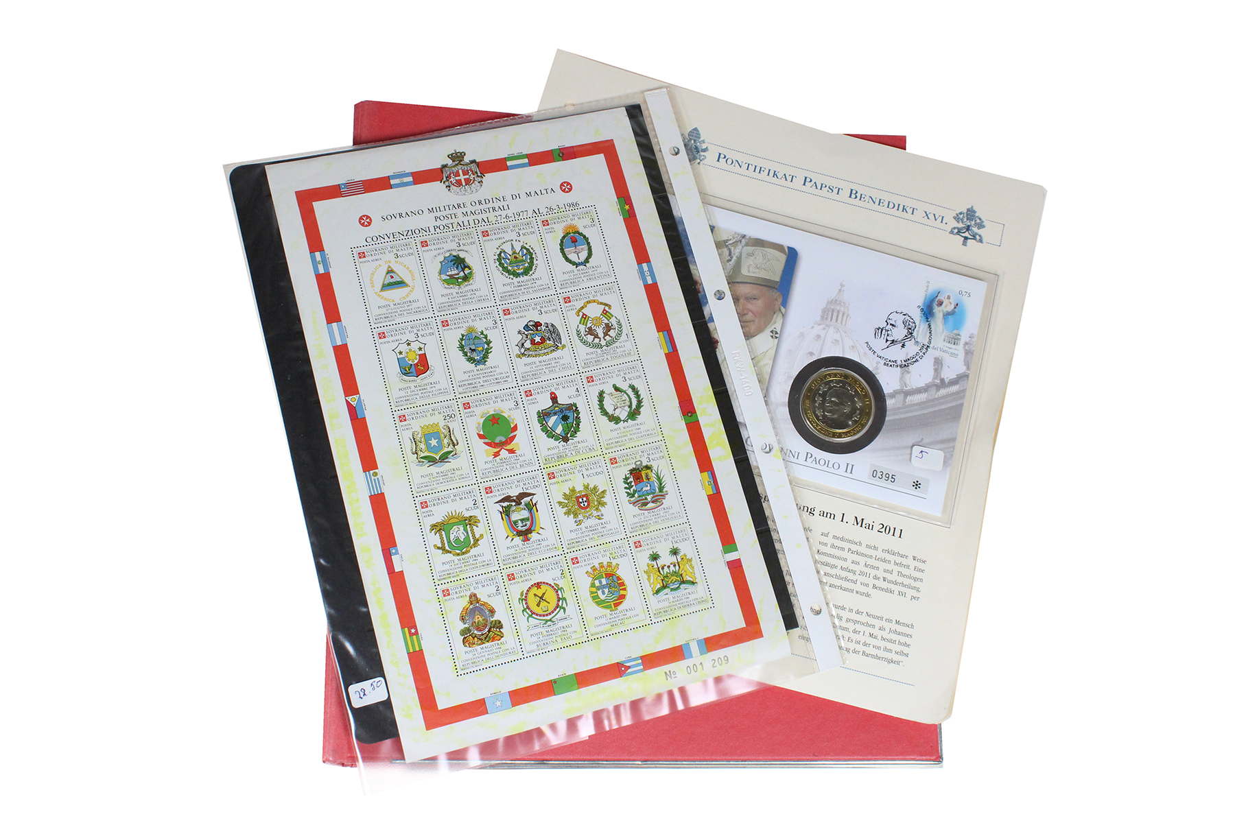 Album met vnl. postzegels en slechts enkele moderne penningen. Veel info, weinig inhoud.