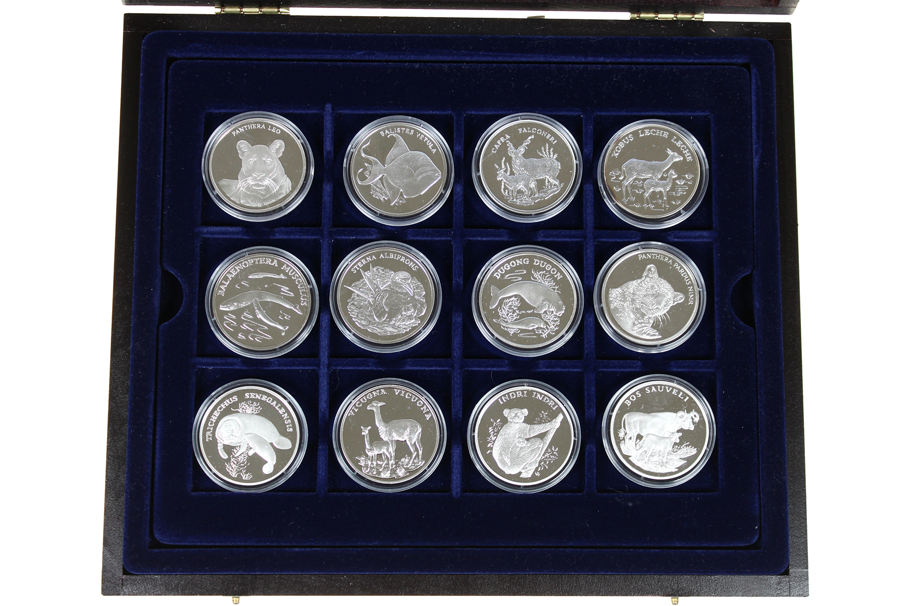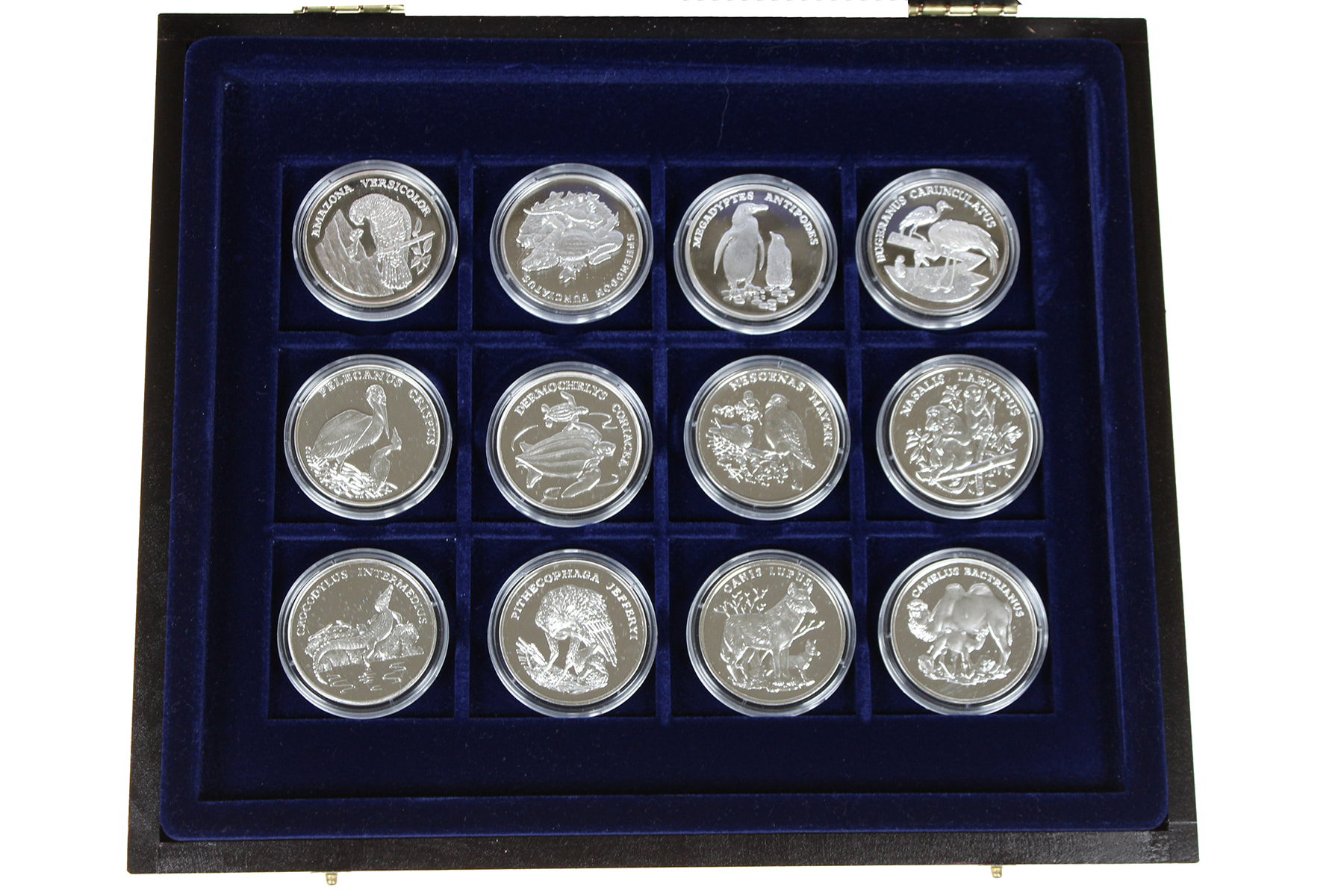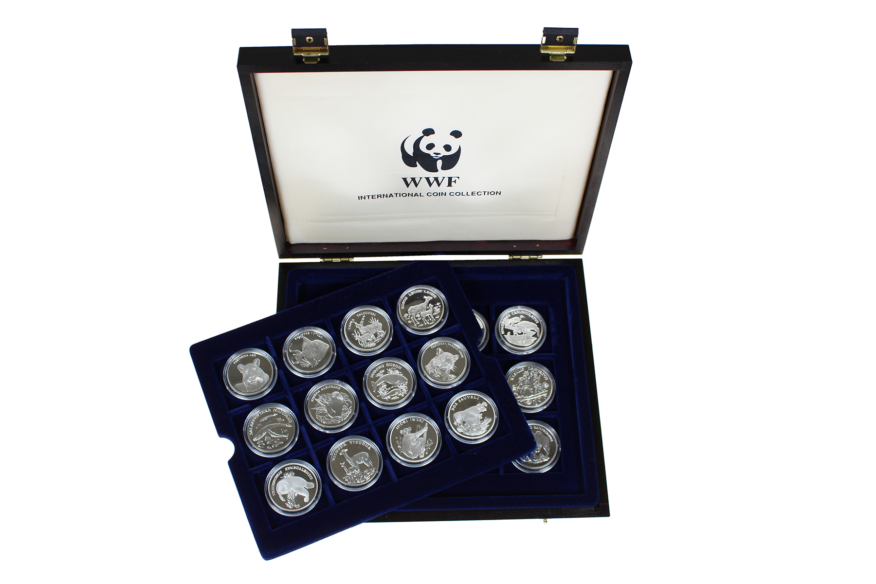 1986. Cassette “WWF International Coin Collection” met 24 zilveren penningen met diverse dieren. Incl. info. Netto zilver: 479,5 gram.