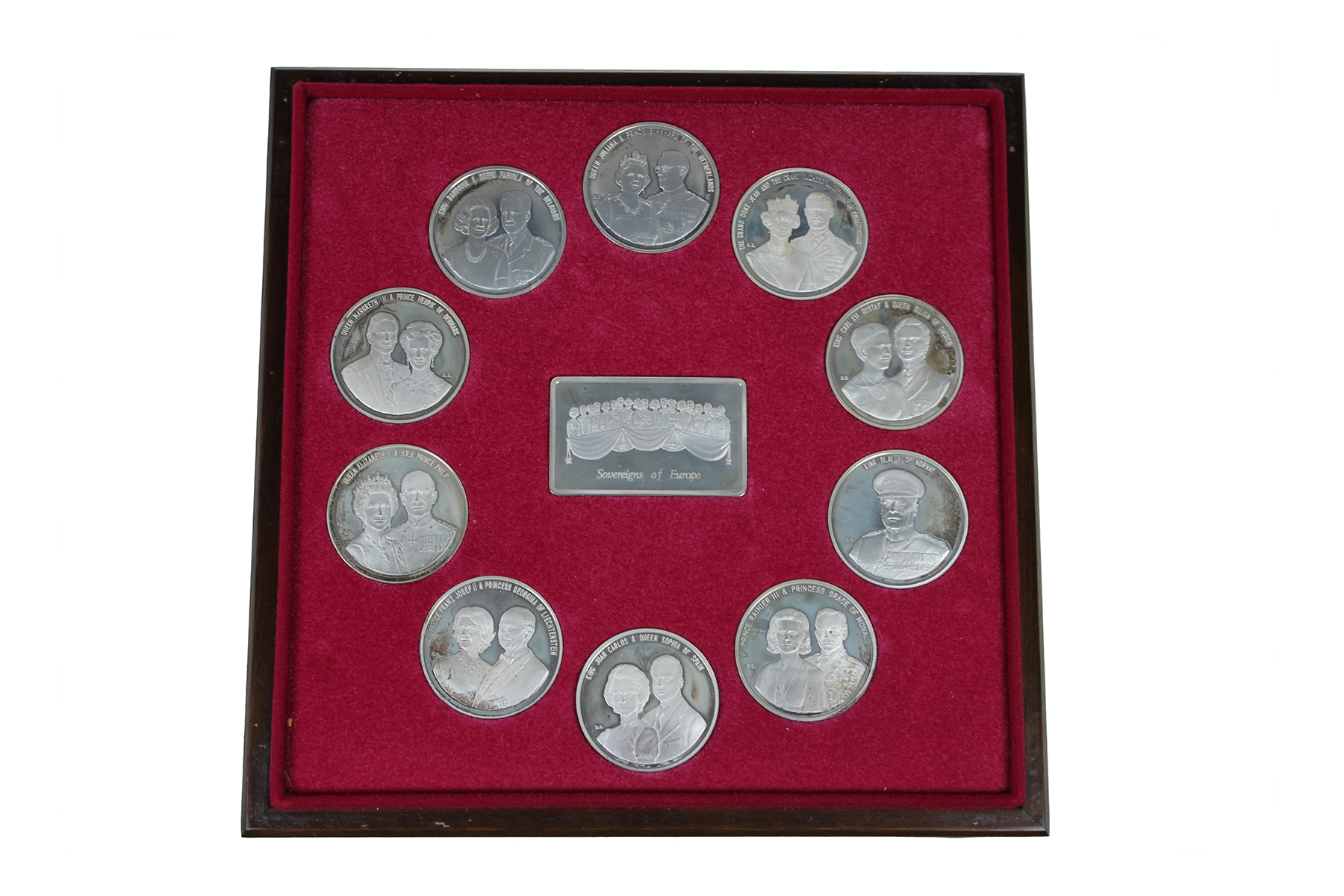 Houten cassette “Sovereigns of Europe” met 10 sterlingzilveren penningen elk een Europees koningshuis afbeeldend. In 1977 vervaardigd bij de Birmingham Mint. Netto zilver: 499,5 gram.